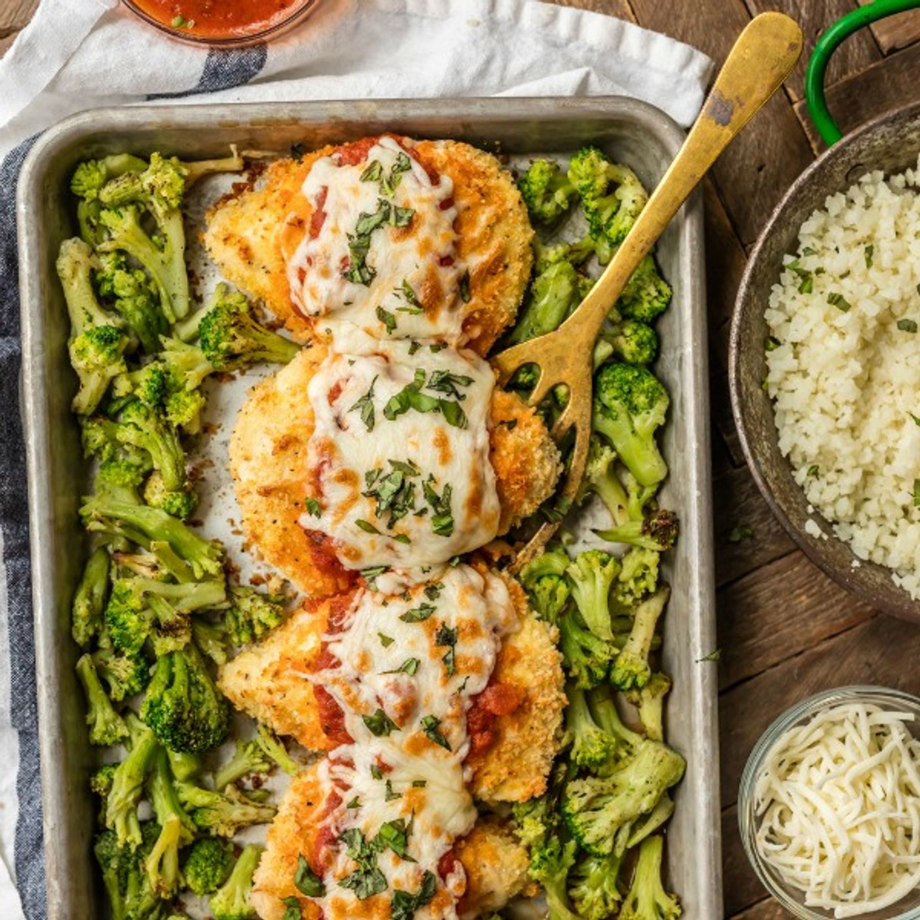 Healthy SHEET PAN CHICKEN PARMESAN; baked chicken parmesan topped with marinara, melty mozzarella, and fresh basil…what could be better?