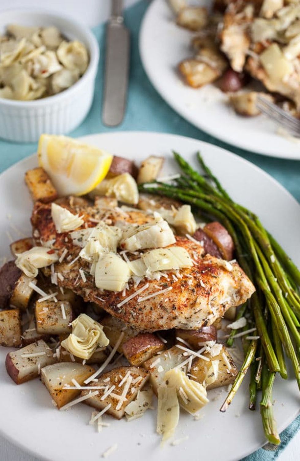A super simple Mediterranean-style sheet pan recipe featuring roasted chicken breast, potatoes, and asparagus topped with zesty artichokes and lemon.