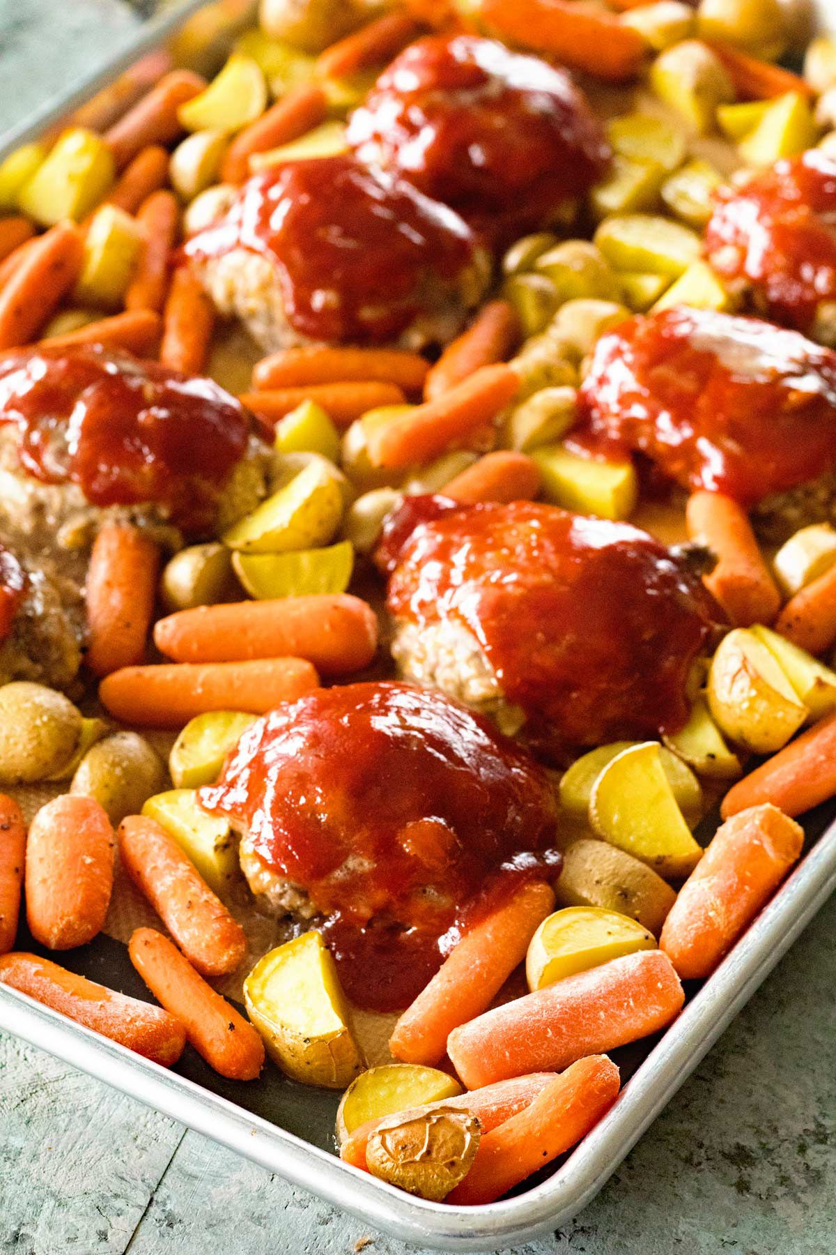 Sheet Pan Mini Meatloaf and Veggies ~ An Easy Sheet Pan Dinner! Homemade Mini Meatloaves, Carrots and Potatoes all Made on One Sheet Pan for Busy Nights!