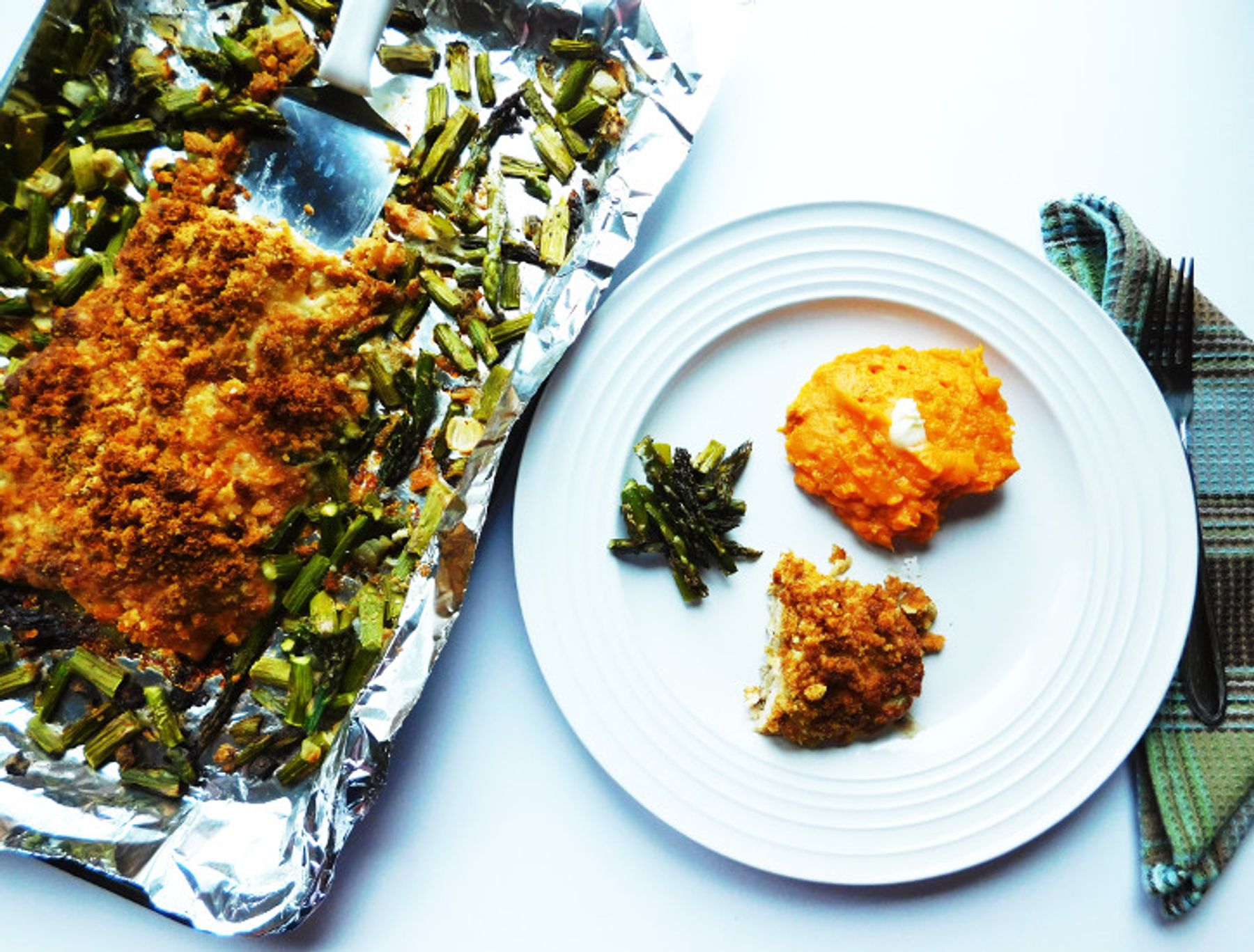 Salmon is coated in a creamy sauce and topped with crunchy breadcrumbs. Baked in 30 minutes until flaky. A sheet pan supper for the whole family.