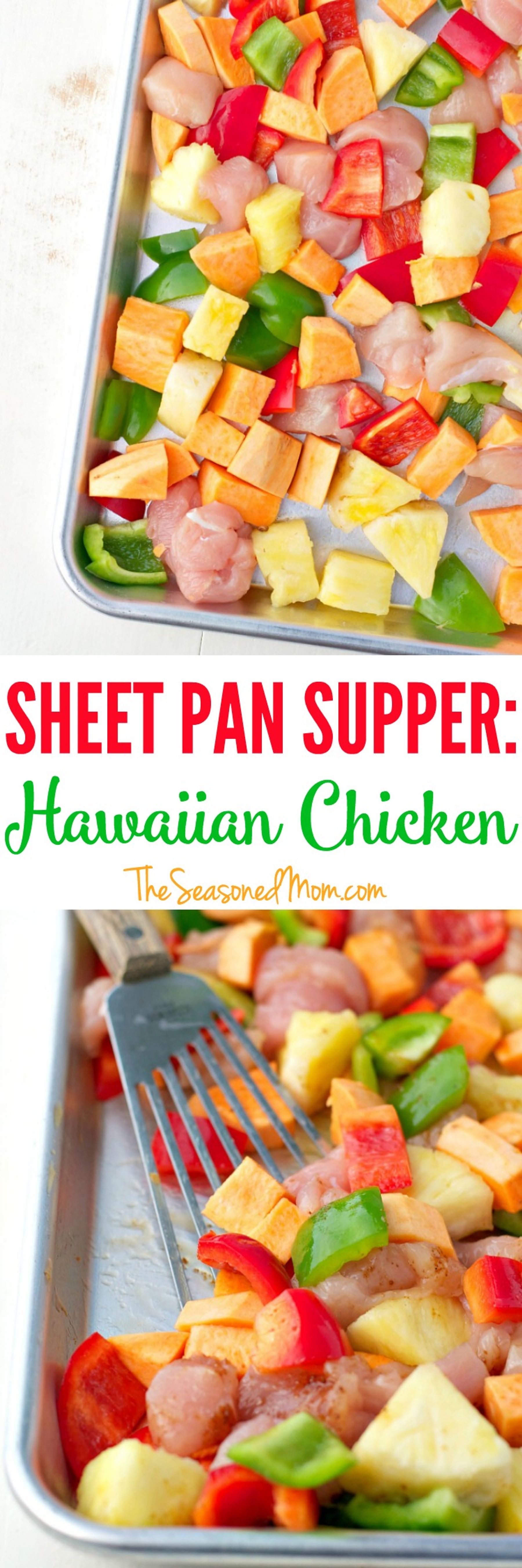 This Hawaiian Chicken with Sweet Potatoes, Peppers, and Pineapple is an easy dinner that cooks entirely on one tray! It’s a healthy Sheet Pan Supper that the whole family will love — with only a few dishes to wash at the end!