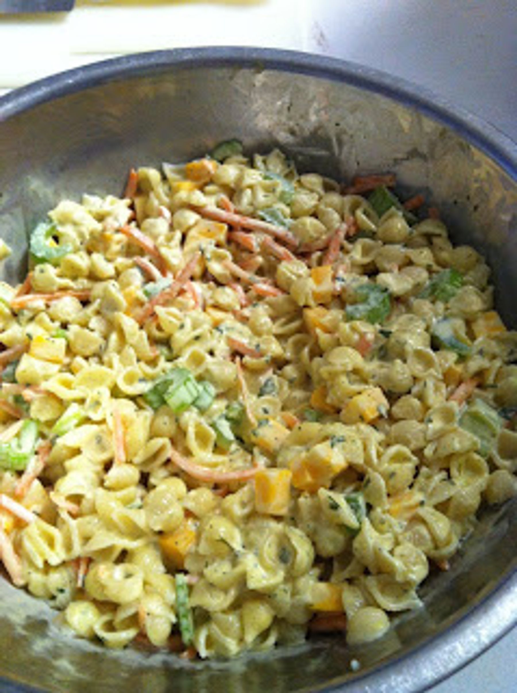 After cooking pasta according to package directions, make sure the noodles are cool and mix remaining ingredients in large mixing bowl. Serve Chilled