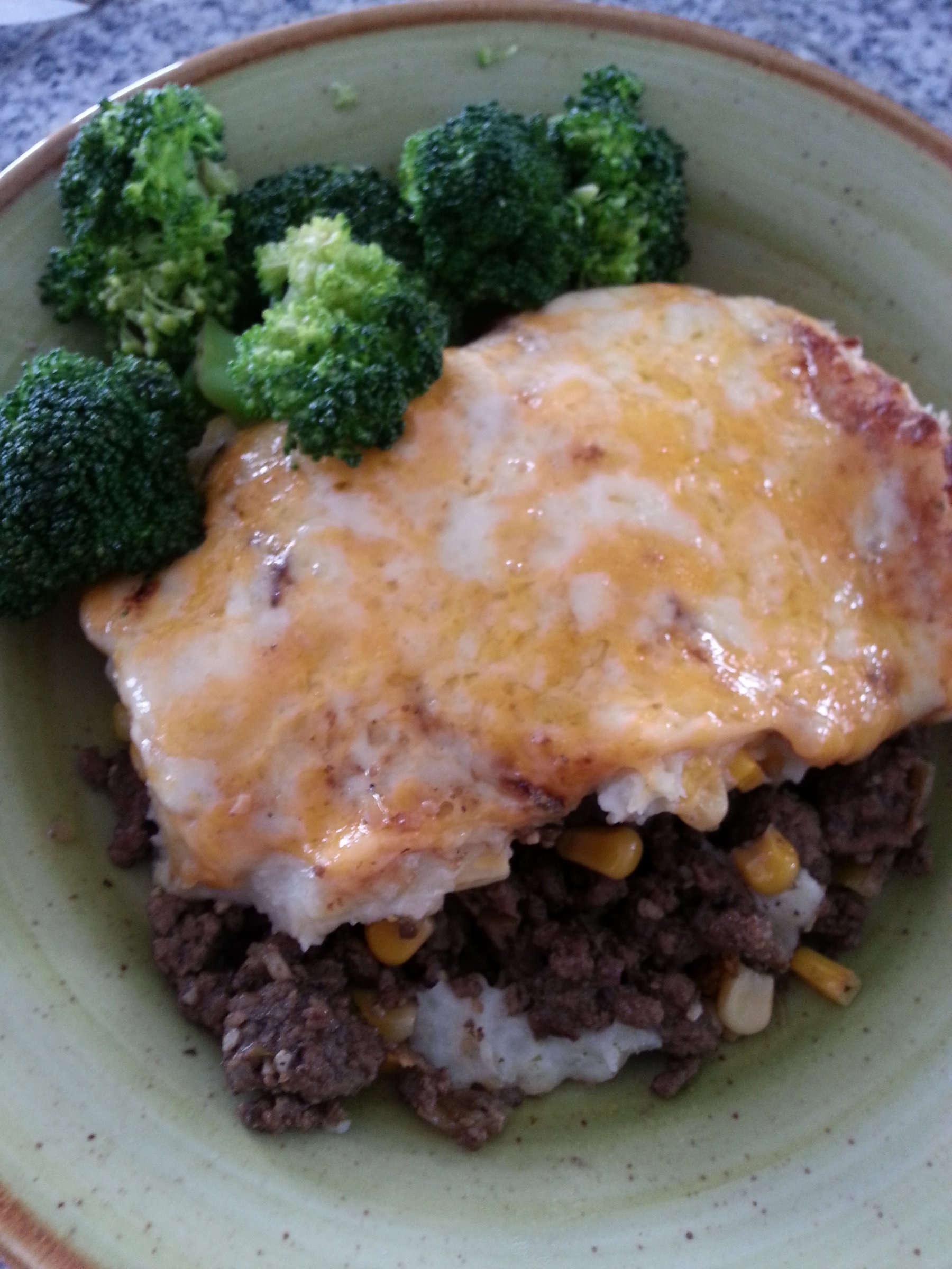B) Pour into casserole baking pan. Layer Corn, salt & Pepper, then layer the mashed potatoes.