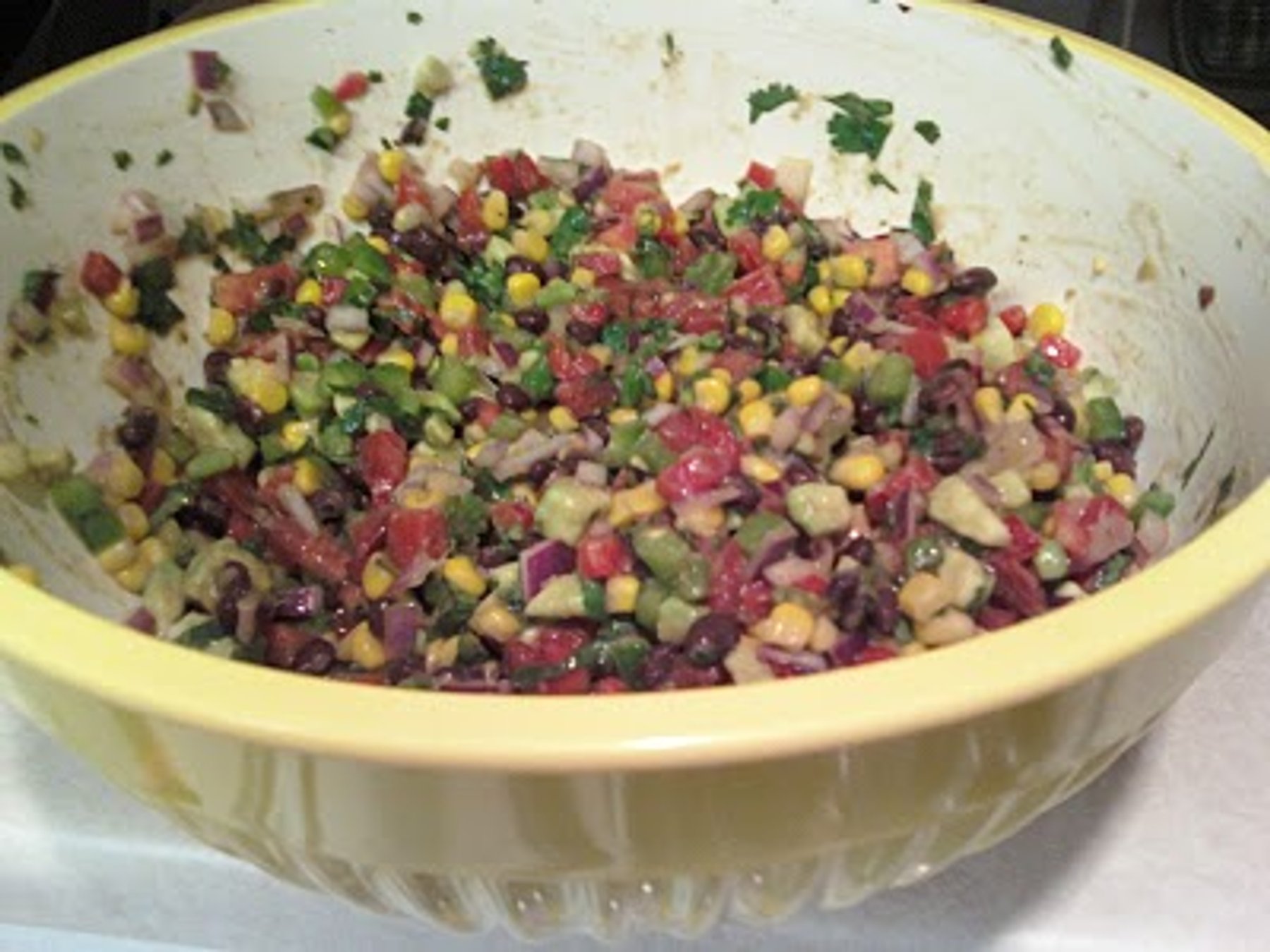 Chop, chop, chop. Throw everything into a big bowl and mix generously. This is the original recipe, but I usually do a bit more lime juice and cumin and cilantro. You can really change and/or add anything...