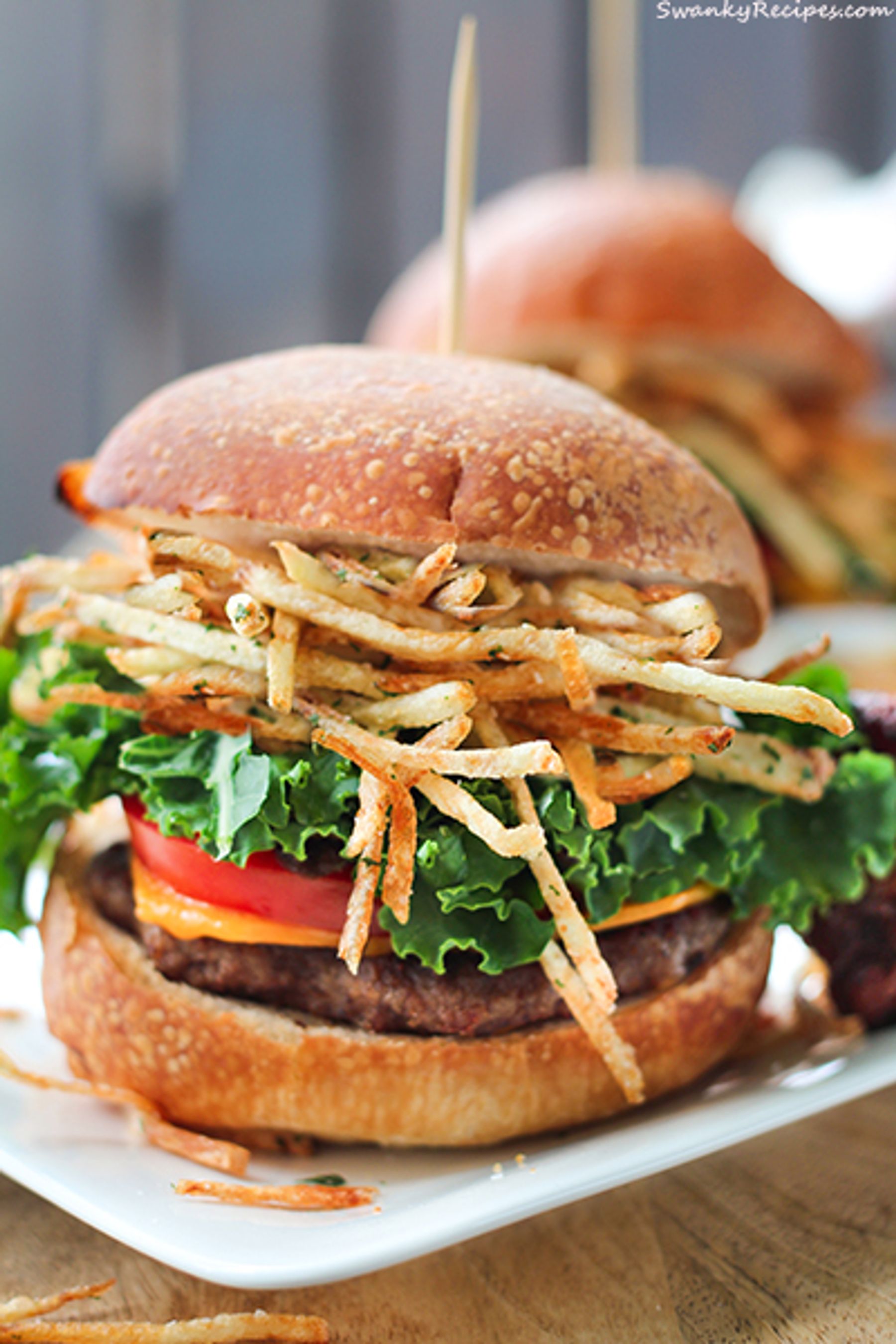 Beefy Grilled Sliders with homemade shoestring french fries. Paired with Honey BBQ chicken wings for the ultimate game day appetizer. The perfect combination for entertaining, snacks, dinner. The recipe feeds a crowd!