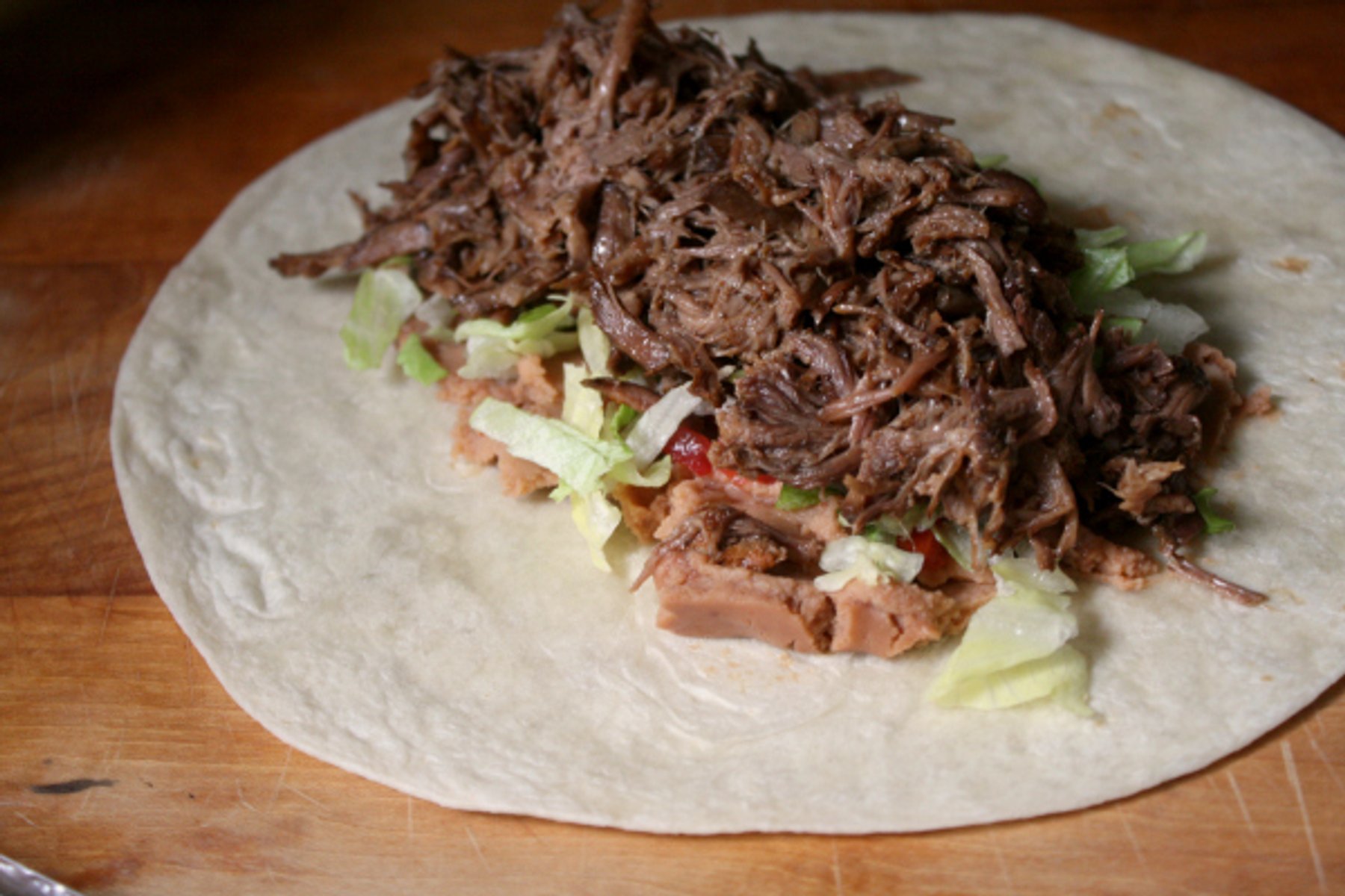 Refried beans, lettuce, and tomatoes are stuffed inside a giant flour tortilla, along with a very generous pile of tender, seasoned shredded beef. They are then smothered in a "gravy", reminiscent of enchilada sauce, then blanketed in cheese and baked.