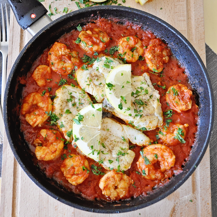 Shrimp and Monkfish Skillet with Spicy Tomato Sauce