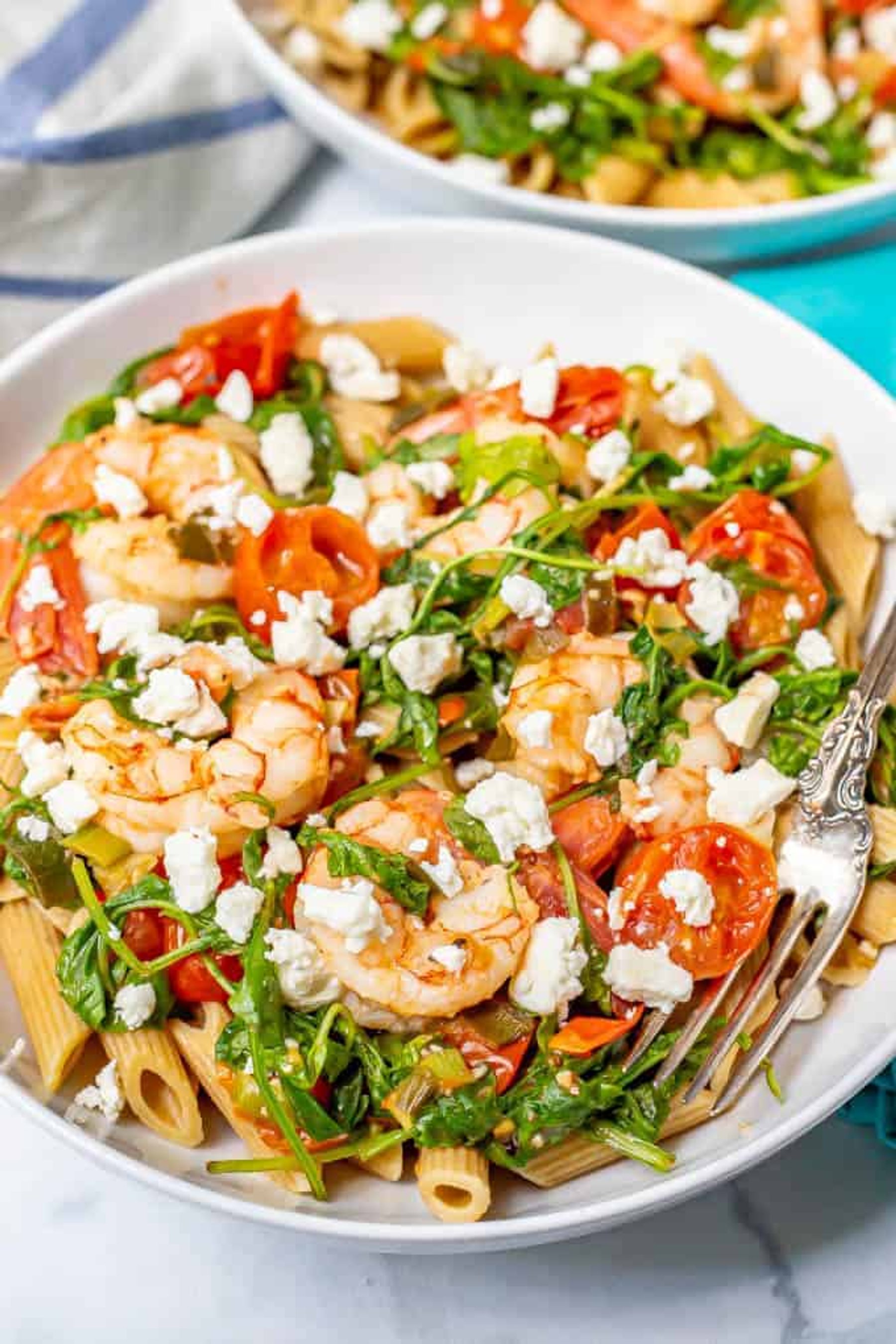 Shrimp and penne pasta with tomatoes, scallions and arugula is an easy, flavorful dish that’s topped with feta cheese. Great for a seafood dinner!