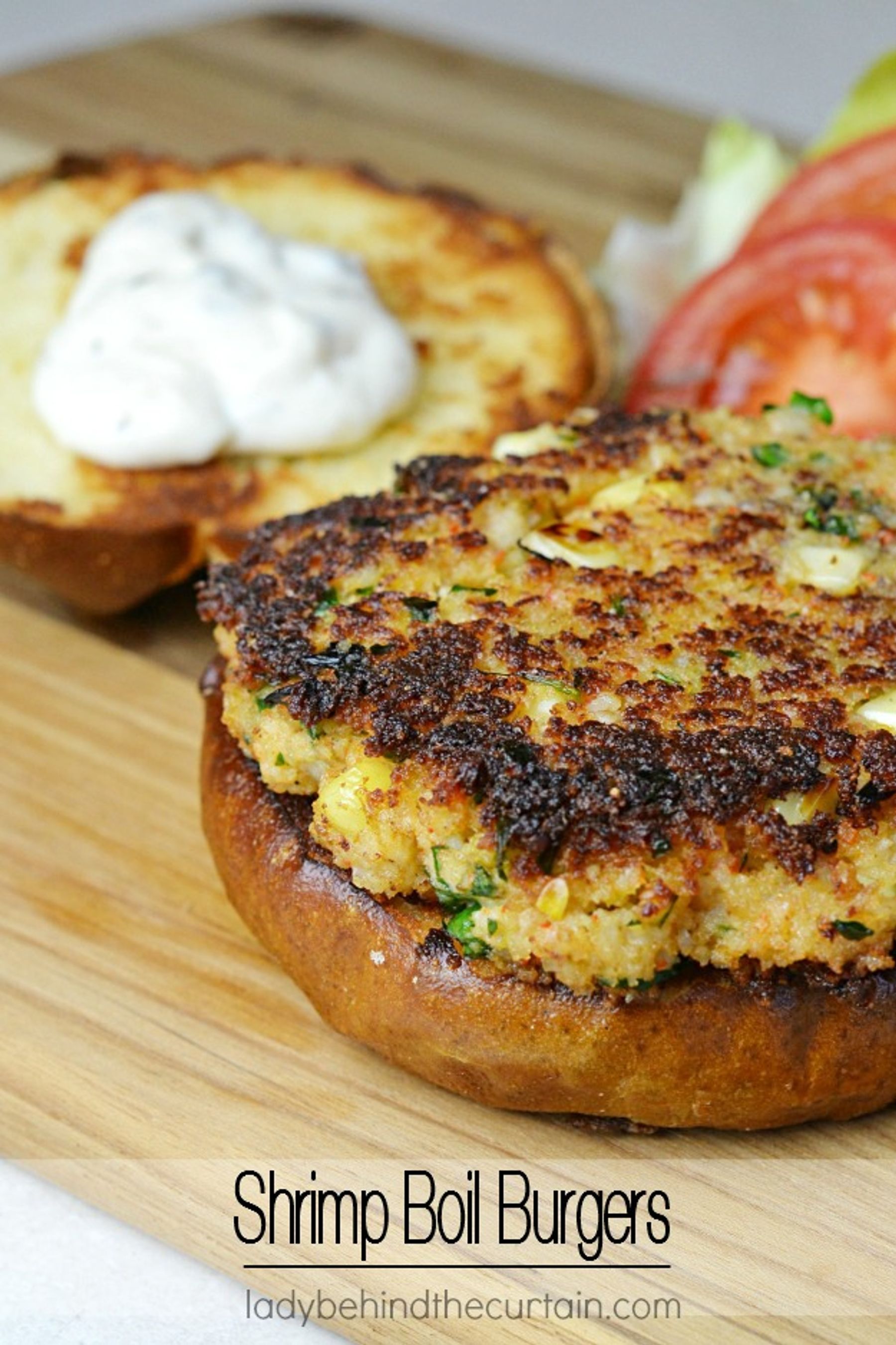 A tender burger made with succulent shrimp boiled in beer, ground up and added to your favorite shrimp boil ingredients.