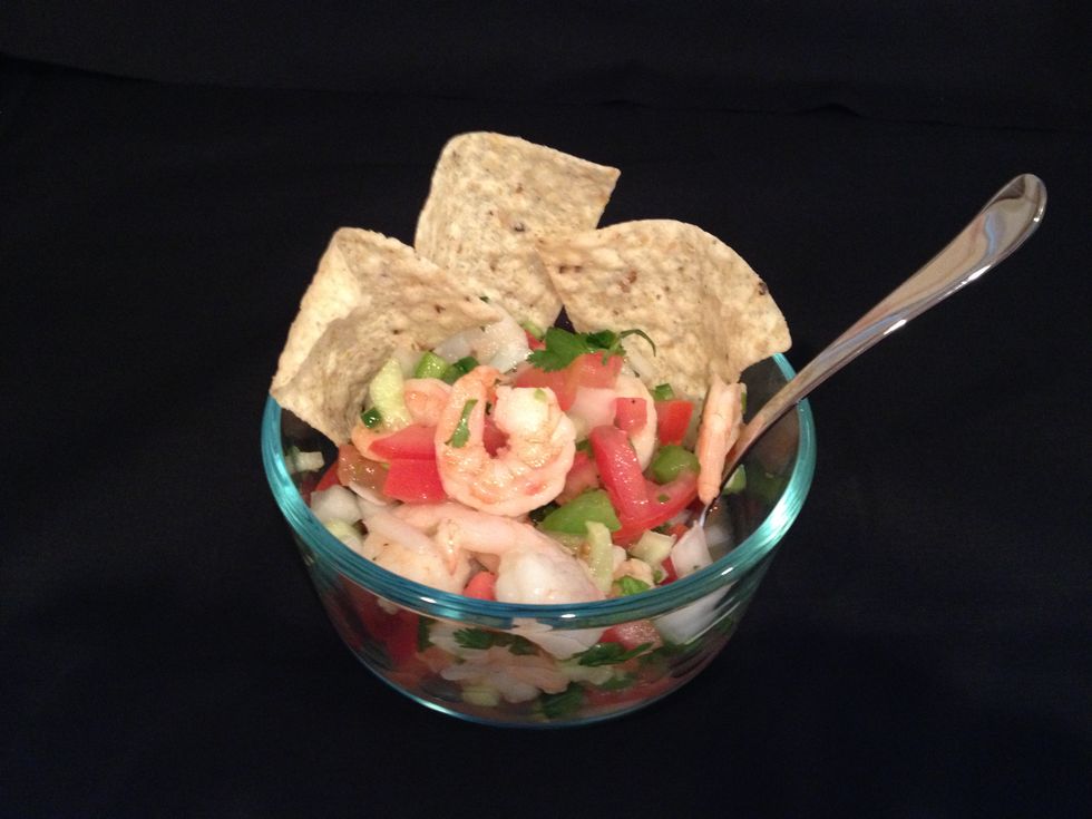 Mix all of the chopped vegetables, the juices and the cilantro in a non-metal bowl and season it with salt and pepper to taste. Mix in the shrimp. Cover and let refrigerate at least 8 hours for cooked...