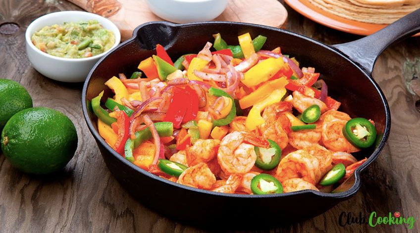 Making fajitas is very easy at home if you have all the ingredients on hand. The line up for the fajita fiesta is pretty traditional. Colorful peppers and onions, garlic, shrimp and the serving fixings. And everything is cooked in one pan.