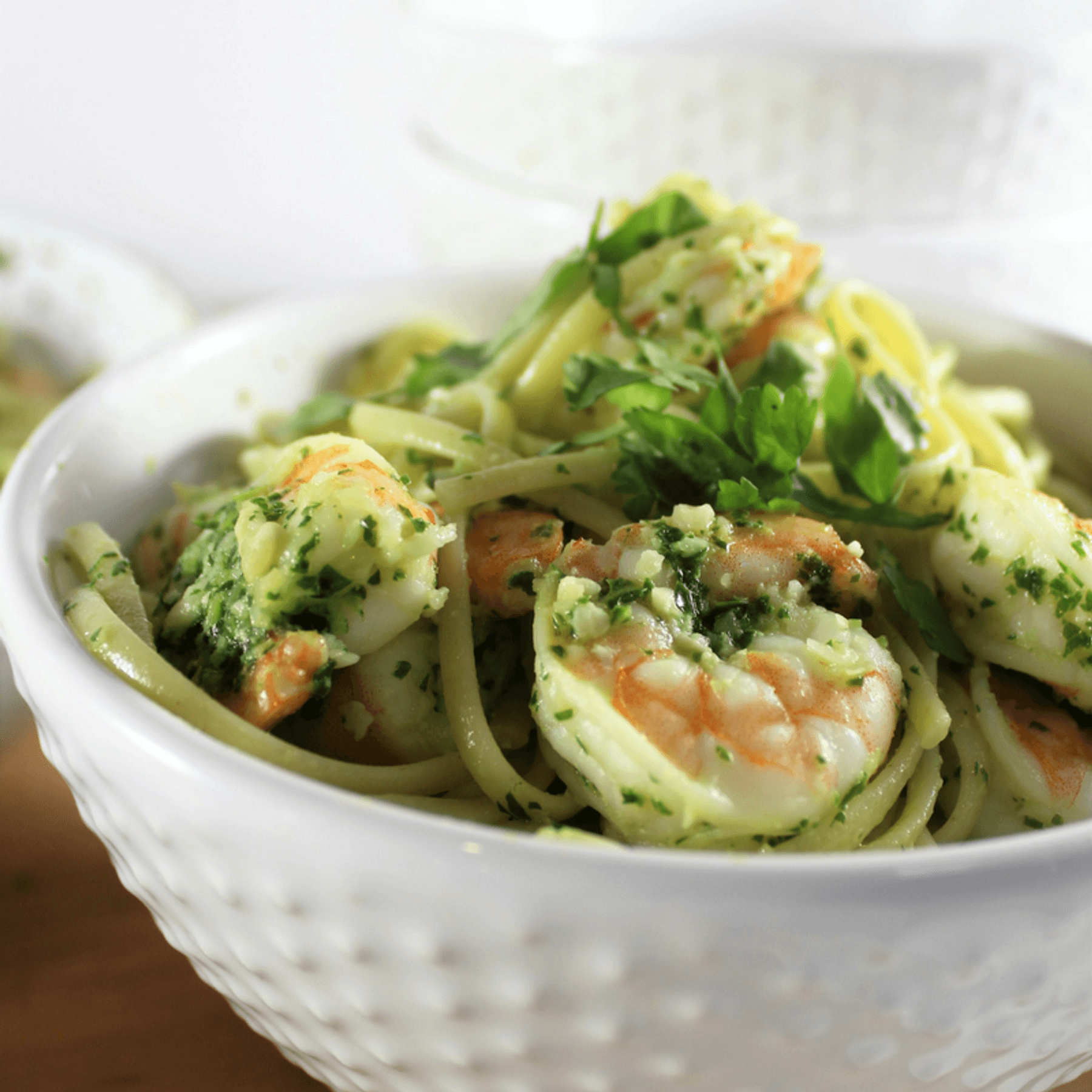Shrimp Pesto Linguine with a homemade kale pesto sauce, shrimp sautéed in butter and linguine pasta. This meal only takes about 15 minutes to cook, is packed full of nutrition with the kale pesto and is hearty and comforting.