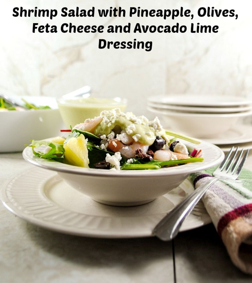 Shrimp Salad with Pineapple, Olives, Feta Cheese and Avocado Lime Dressing