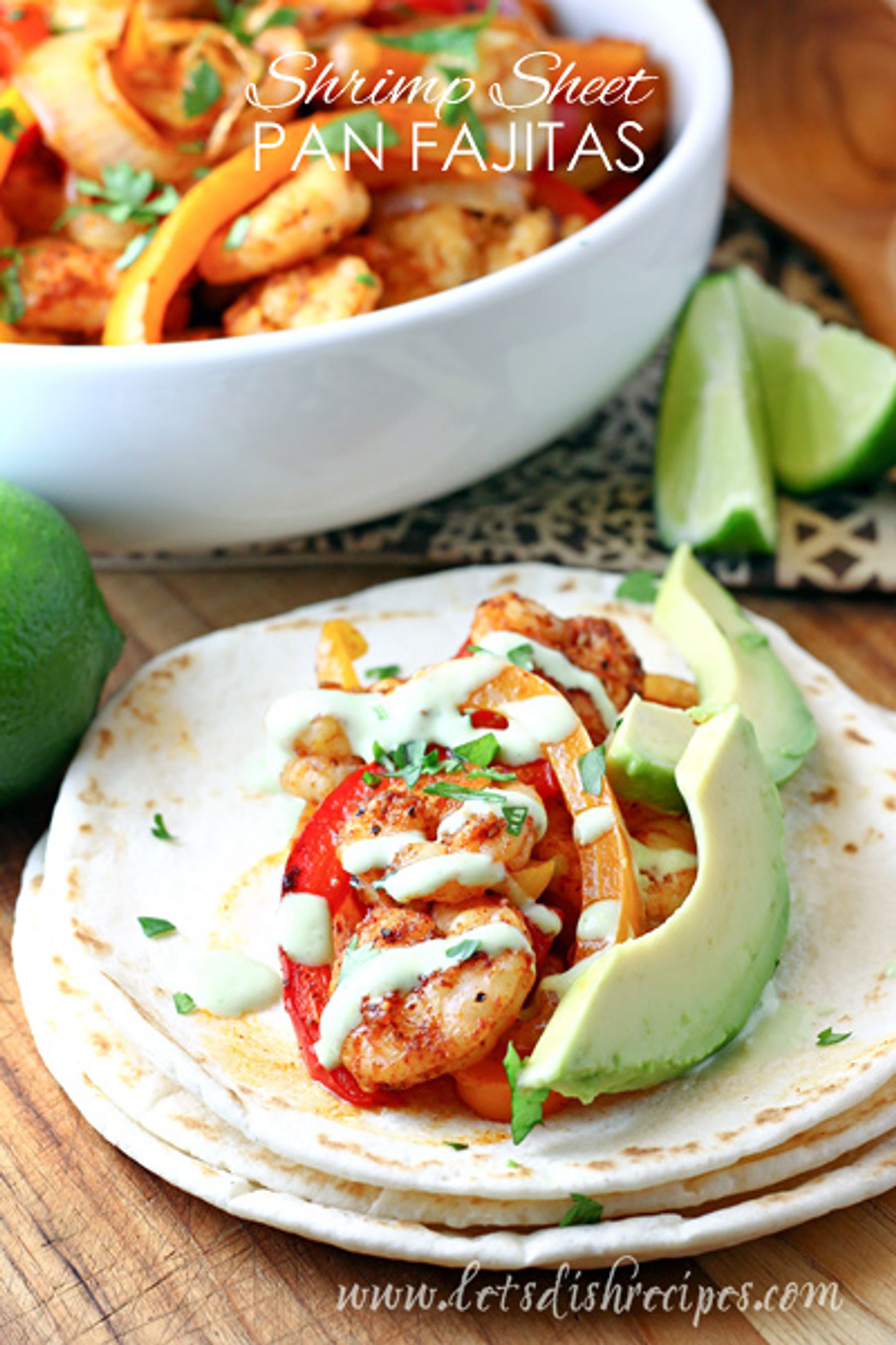 Shrimp and peppers, roasted and served in tortillas with cilantro lime sour cream.