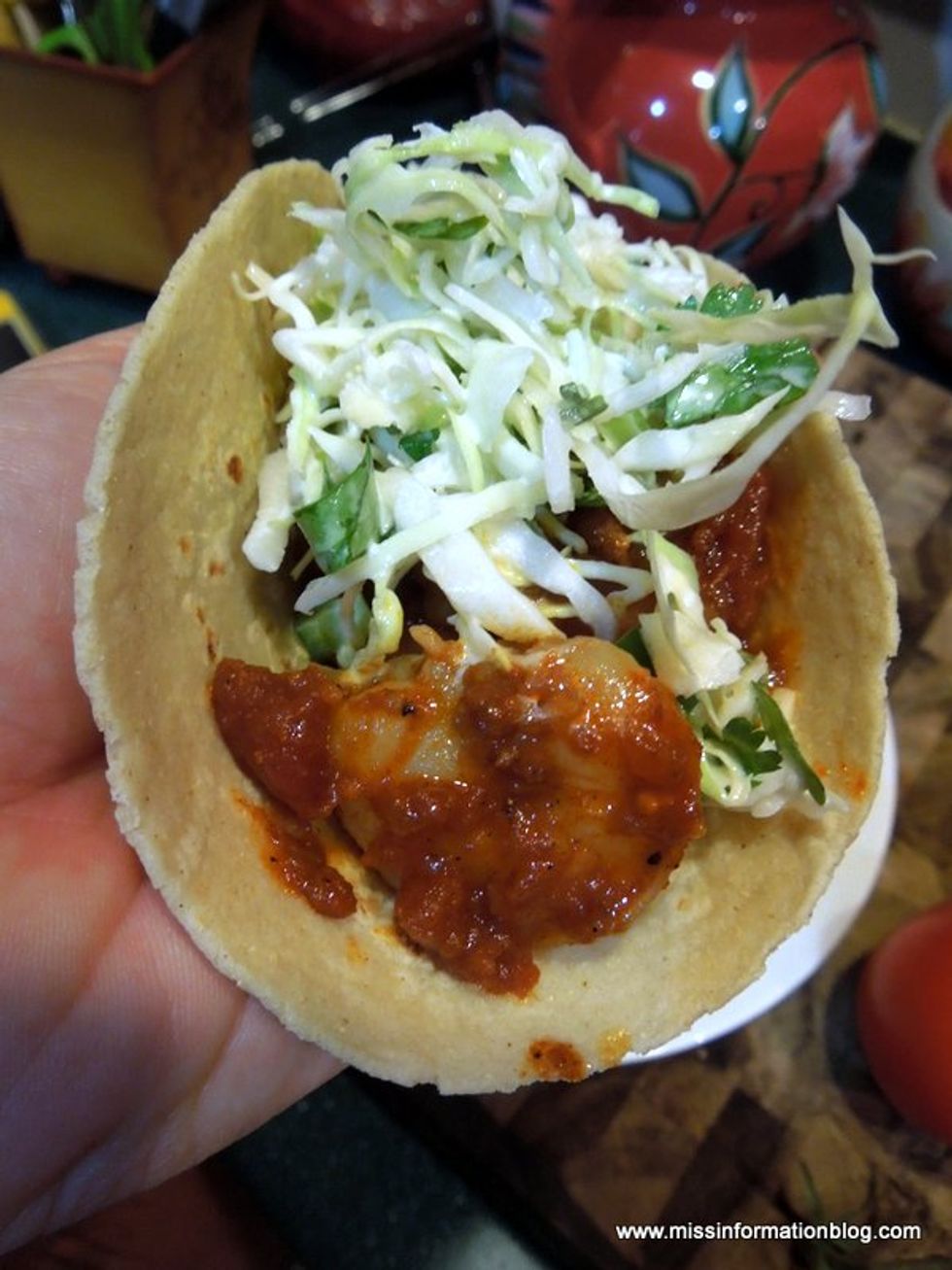 Flavorful Shrimp cooked in a rub and simmer sauce, then topped with a jalapeno coleslaw. You can put them in corn or flower tortillas. It's creamy, just a little heat but not a lot, and crunchy everything you want in a taco.