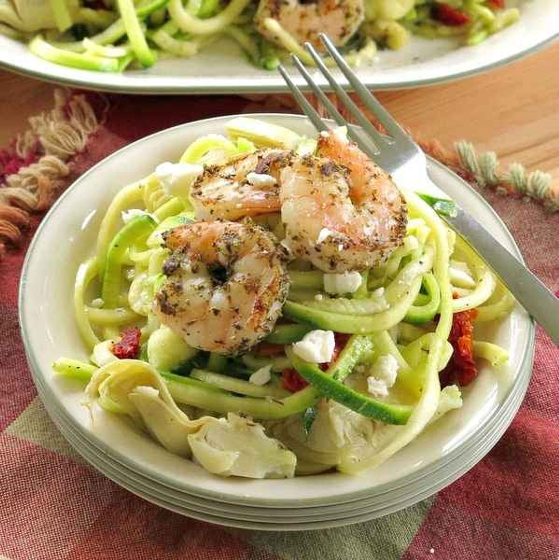 Shrimp Zoodles Recipe with artichokes, sundried tomatoes and pine nuts is ready in under 30 minutes. It's also low-carb, gluten-free and sooo tasty.