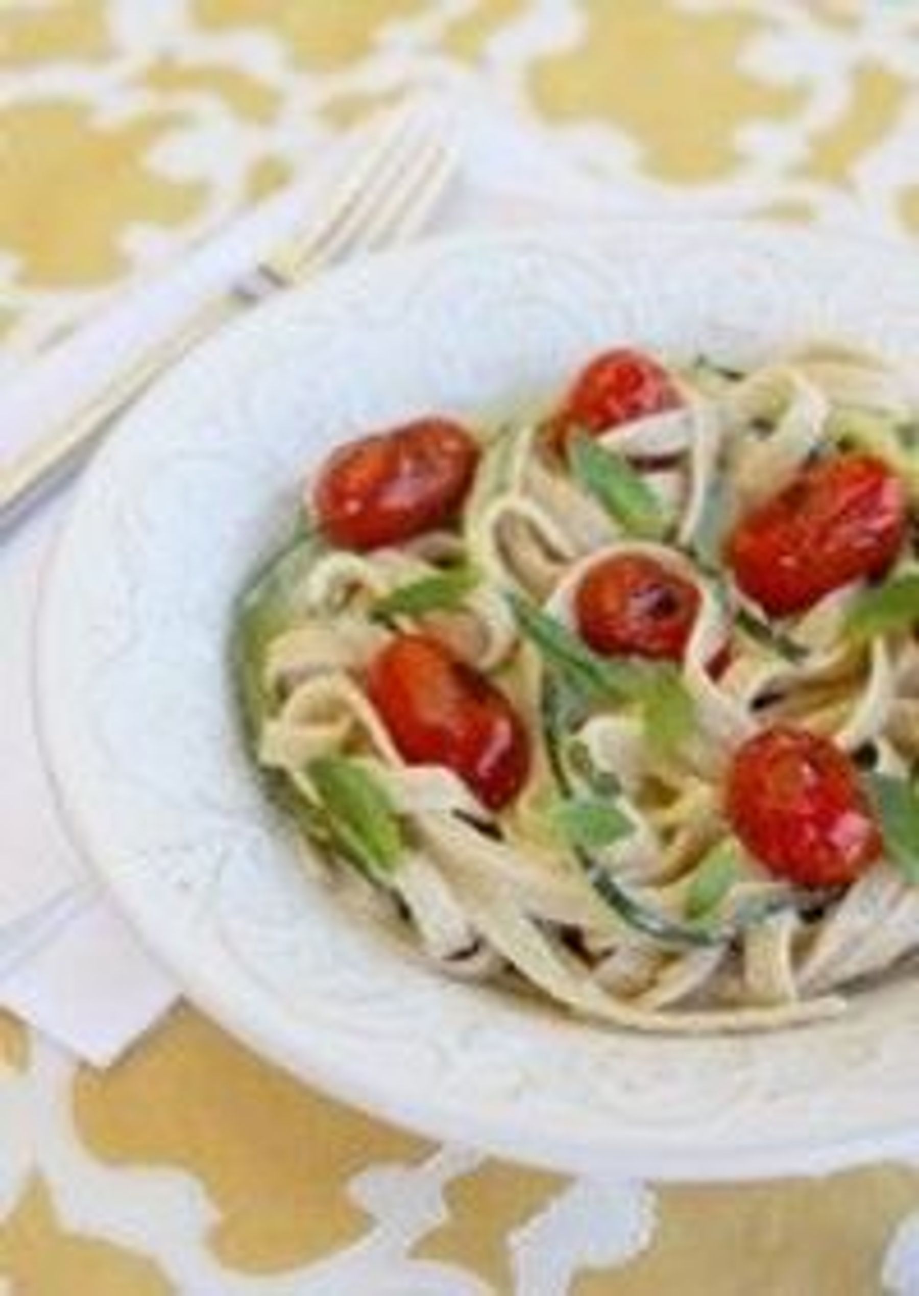 When pasta is just about done, add zucchini strips to pot (so they’re cooking with the pasta). Boil for about 2 minutes, or until tender. Drain zucchini and pasta and combine with sauce. Gently toss in tomatoes, or simply add them on top of each serving. Garnish with additional basil if desired.