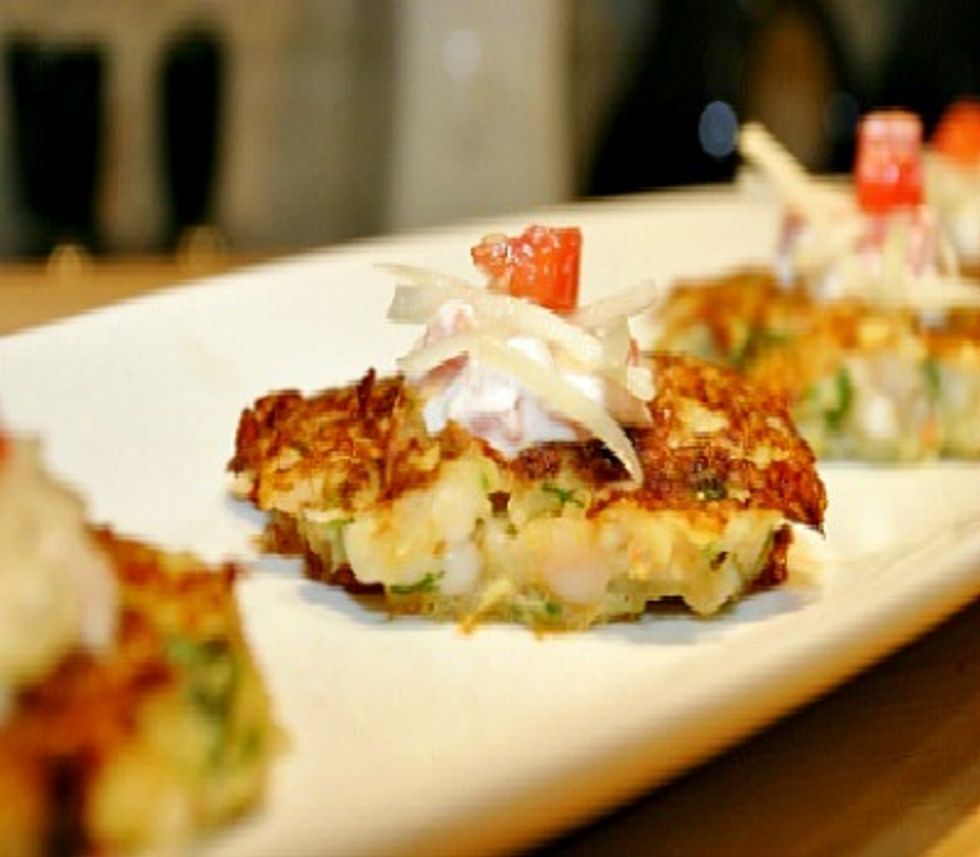 An Indian spiced shrimp fritter made into a "shrimpcake" served with a yogurt sauce