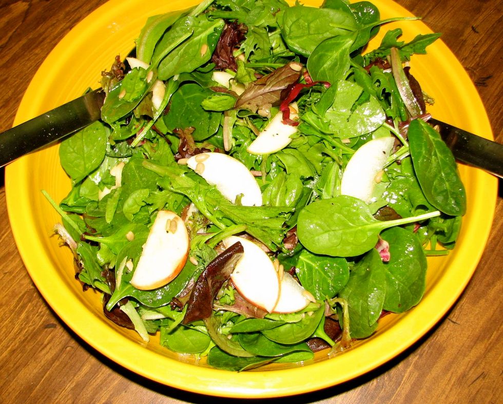 In a large bowl place mixed greens, apple slices and sunflower seeds. Set aside. In a small container with a tight fitting lid add the olive oil, vinegar, mustard, honey, salt and pepper and shake to...