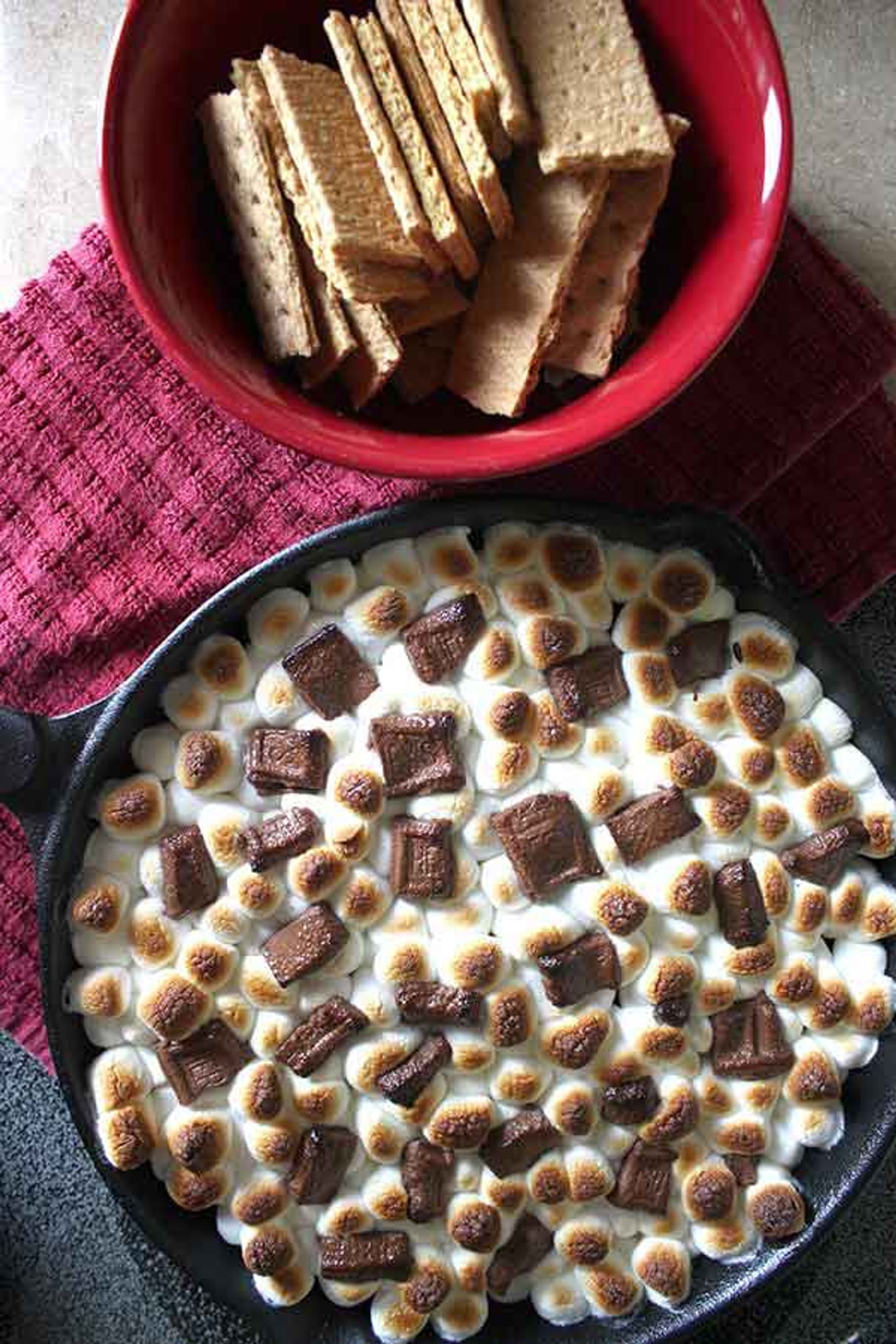 In a cast iron skillet, add the chocolate chips first, then bag of miniature marshmallows.