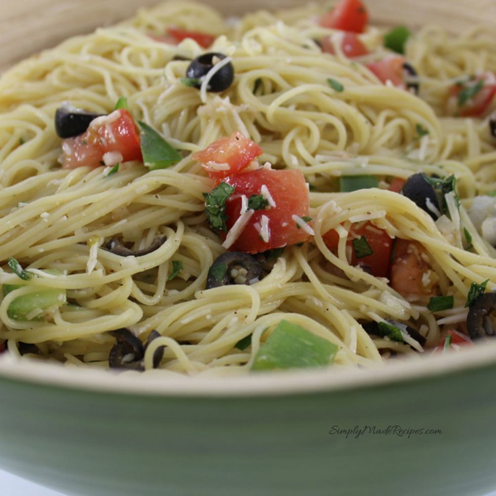 Spaghetti Salad with black olives, Roma tomatoes, green bell pepper, parmesan cheese, onion, fresh parsley and angel hair pasta. Bacon might be a great addition too! We found a salad dressing made from Wish Bone called Garlic Parmesan Vinaigrette that taste samazing! Throw it all together for a delicious cold pasta salad.