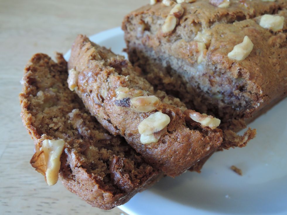 This bread is extremely moist, delicious, and full of banana flavor! This recipe makes one 8x4 loaf and 8 standard sized muffins. After I started pulling out the ingredients for this I realized I had no eggs. However, my lack of foresight led me to using a flax egg instead, and the bread turned out incredible! This bread is super moist and dense, but still maintains a fluffy crumb. It is by far the best banana bread I've ever made, and it is one of the best quickbreads I've ever made!