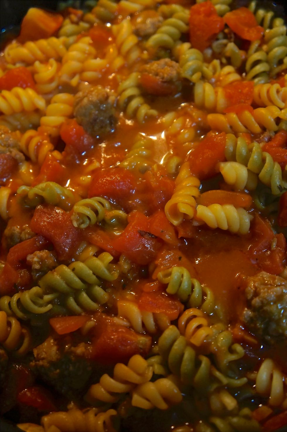Remove the sausage from casing, crumble into bite sized pieces and put into a large skillet. Cook sausage until brown. Add in onion and garlic, cooking until onion is soft. Drain, if needed. Stir in diced...