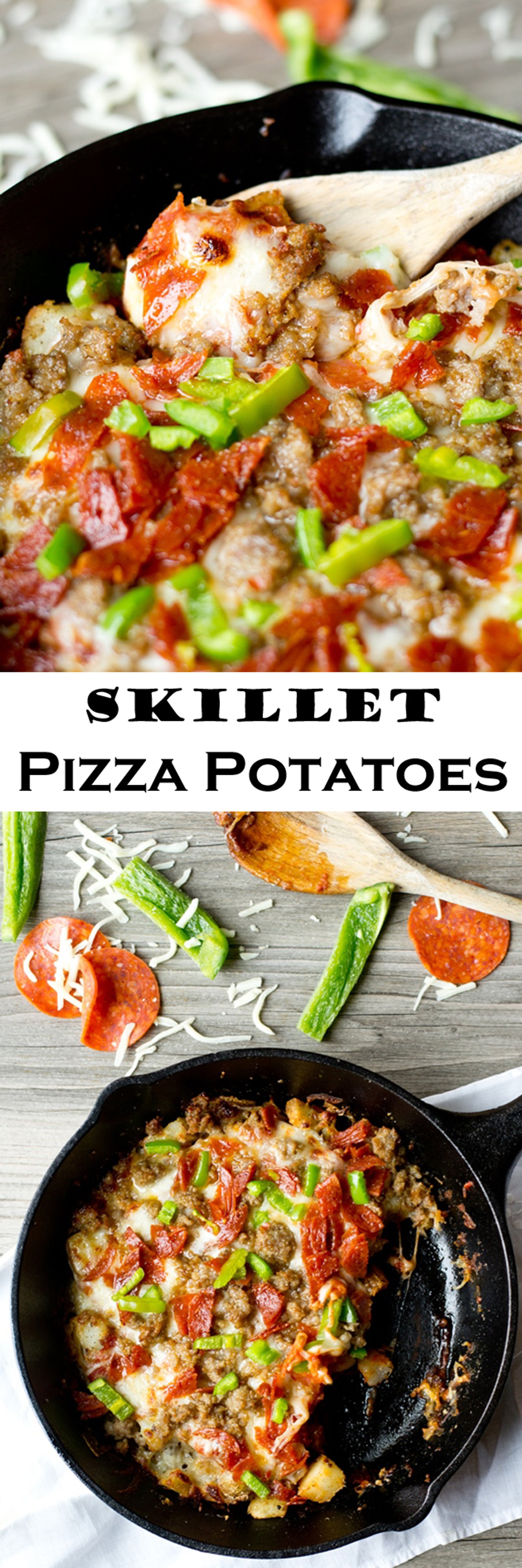Golden fried, skillet pizza potatoes topped with pizza sauce, gooey cheese and the pizza toppings of your choice. This is a great option for those on a grain free and gluten free diet.