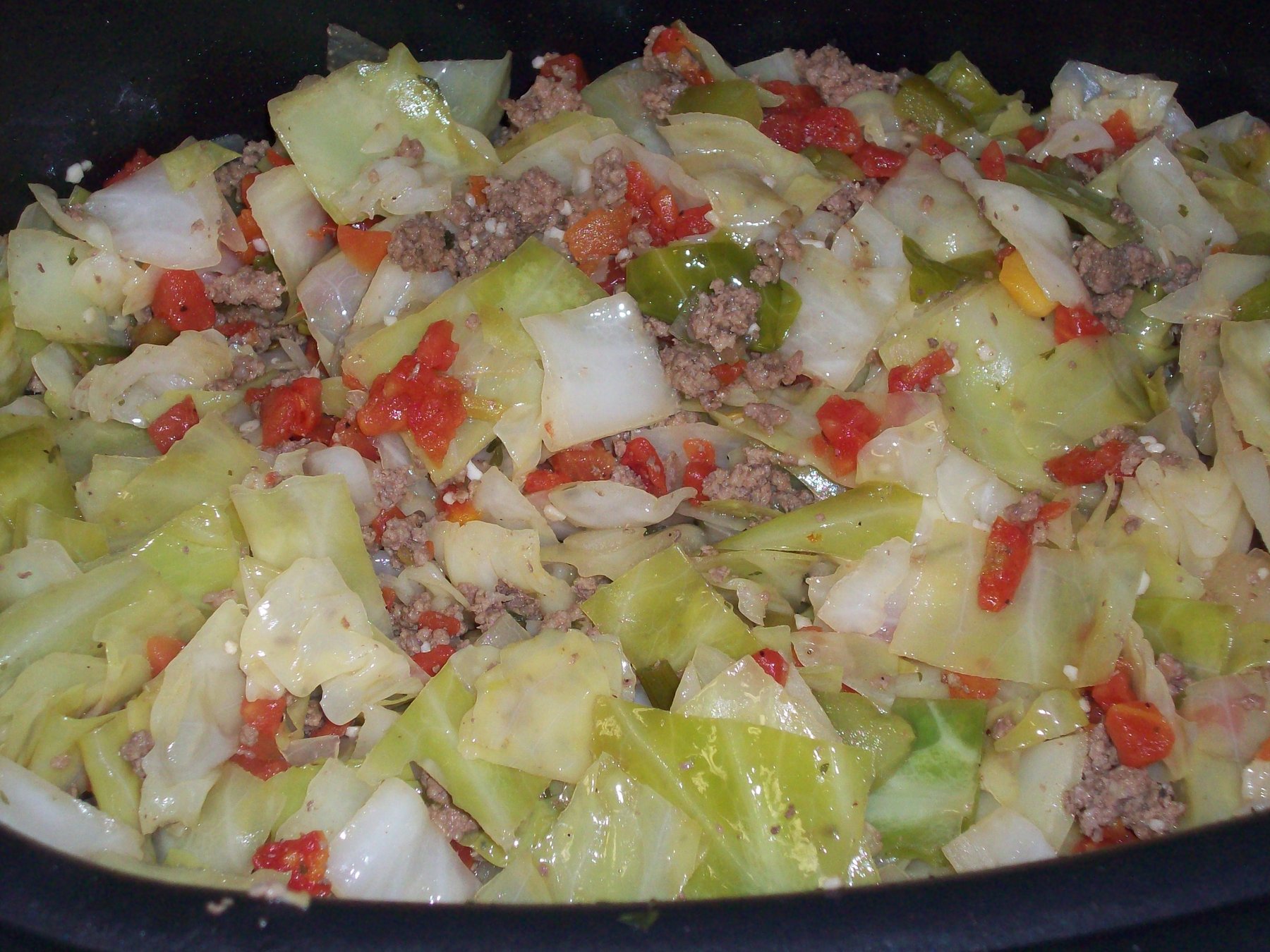 4. Simmer on stovetop medium for about 20-30 minutes, when cabbage is softened. Reduce heat to stovetop low until cabbage done.