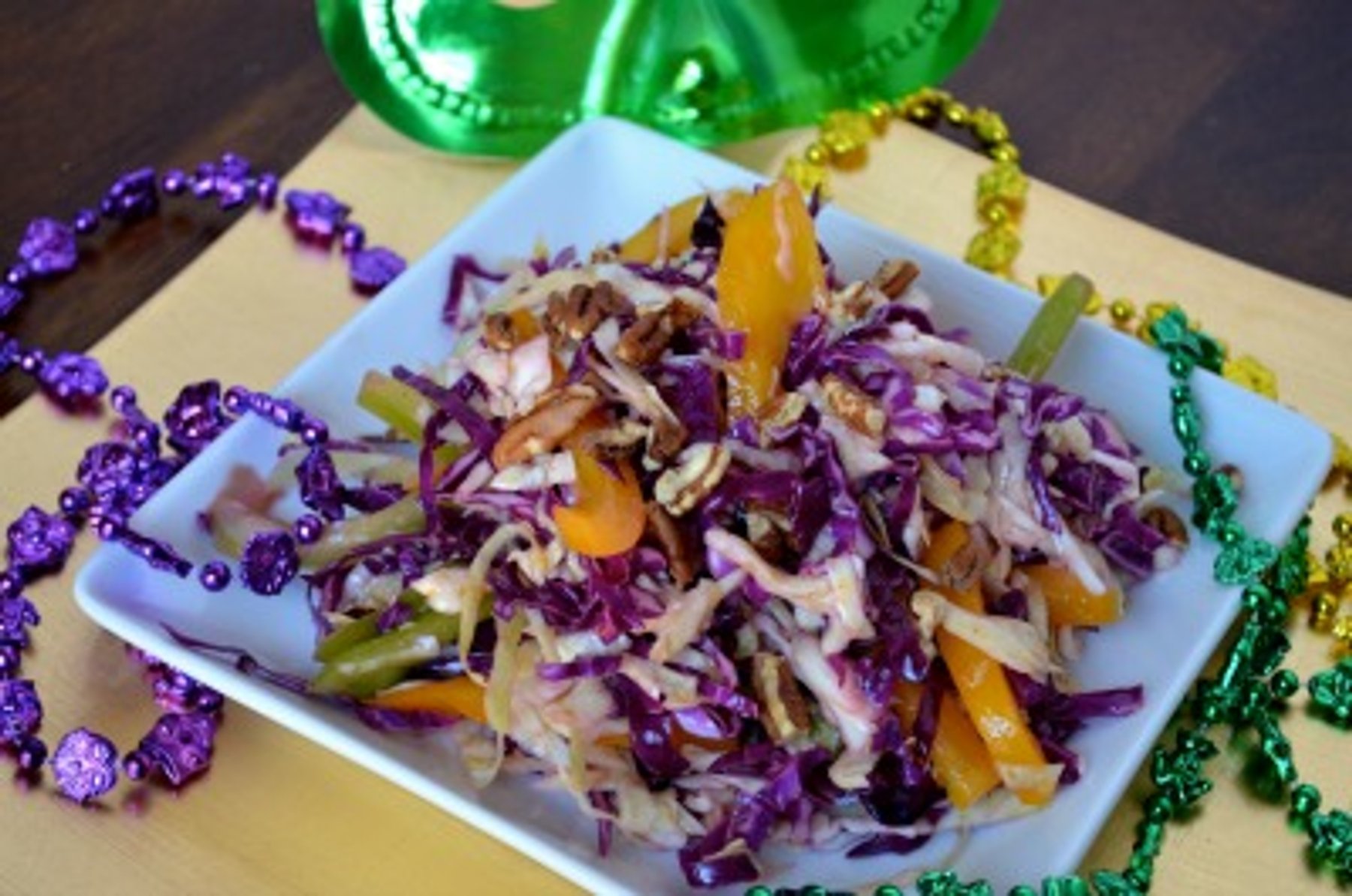 Bring the excitement of Mardi Gras to your dinner table with this gorgeous Mardi Gras Slaw. Feel great serving this dish since it not only reflects the gorgeous hues of Mardi Gras, but also what it offers – an amazing source of vitamin A and C as well as omega-3. How did we ‘Skinny Louisiana’ this slaw? While many slaws contain 1/3 – 1/2 cup of sugar, we reduced the traditional amount of sugar to one tablespoon. To add a bit of flare from our fabulous state, I added a bit of additional spice us