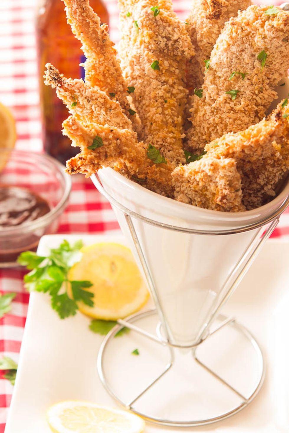 A skinny version of a classic breaded chicken tender, baked not fried! Flavorfully seasoned with rich buttermilk, panko breadcrumbs, and savory ranch topping.