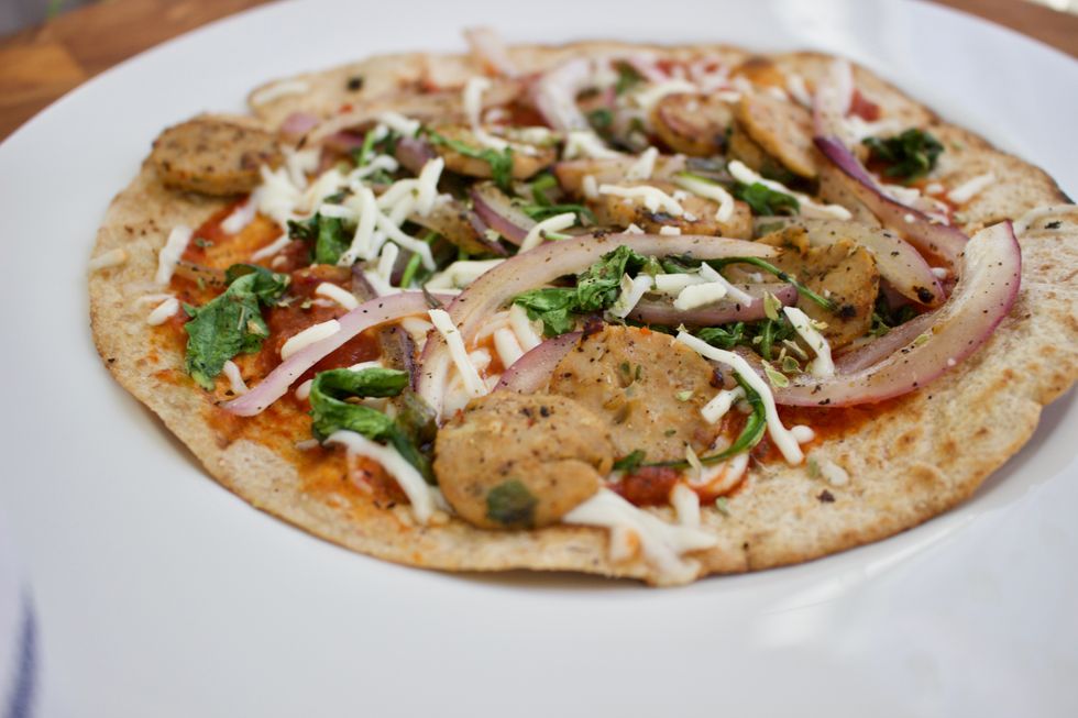 When the nonstick pan is hot, add arugula, chicken sausage and red onion and...