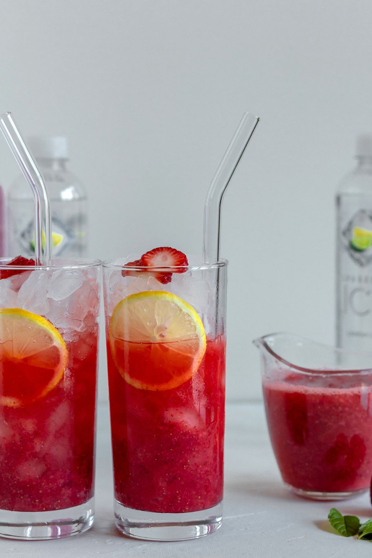 - Fill each glass with 2 tablespoons of strawberry puree. Fill the glasses with ice. Add 1.5 ounces vodka to each, and top with sparkling water. Garnish with sliced strawberries and lemon slices....