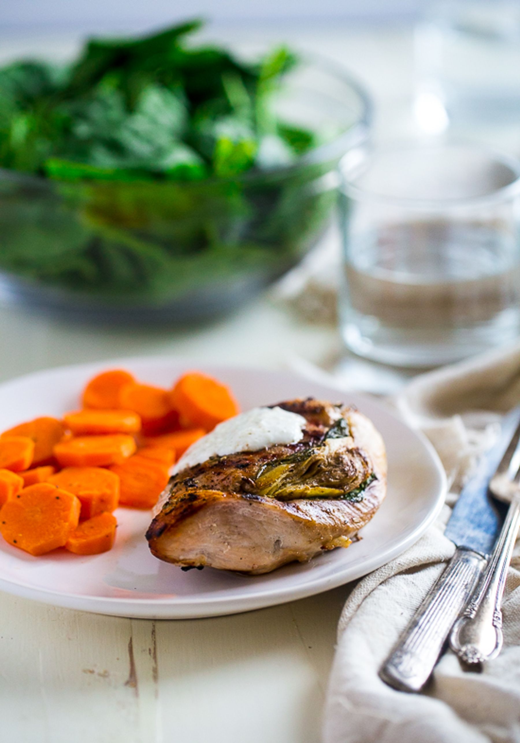 In a large container, whisk together the 3 Tbsp Greek yogurt with the garlic, artichoke liquid and a pinch of salt and pepper. Place the chicken into the container and spoon the mixture over top until...