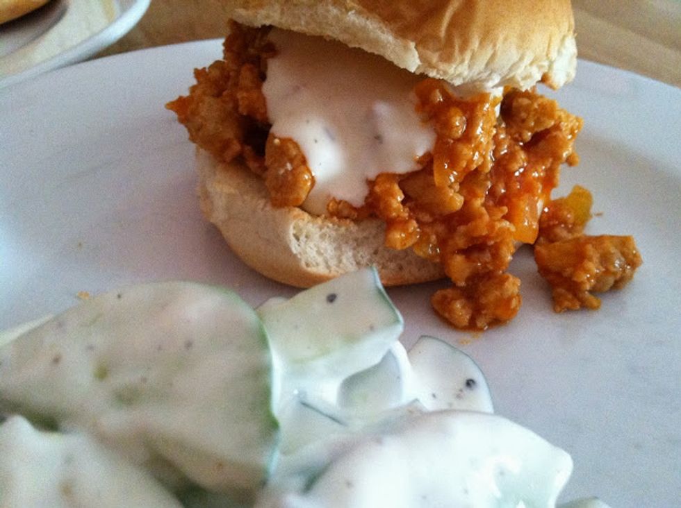 My teenage daughters are obsessed with anything "buffalo" sauced. The other night I came up with a super simple idea to make a riff on the traditional "Sloppy Joe" that everyone remembers; use Buffalo sauce instead of ketchup. I also lightened it up by using ground chicken breast, which in itself can stand up to bold flavor additions. It's got a kick to it, but is not too spicy even for the younger ones due to the addition of Ranch dressing in the sauce and also driz