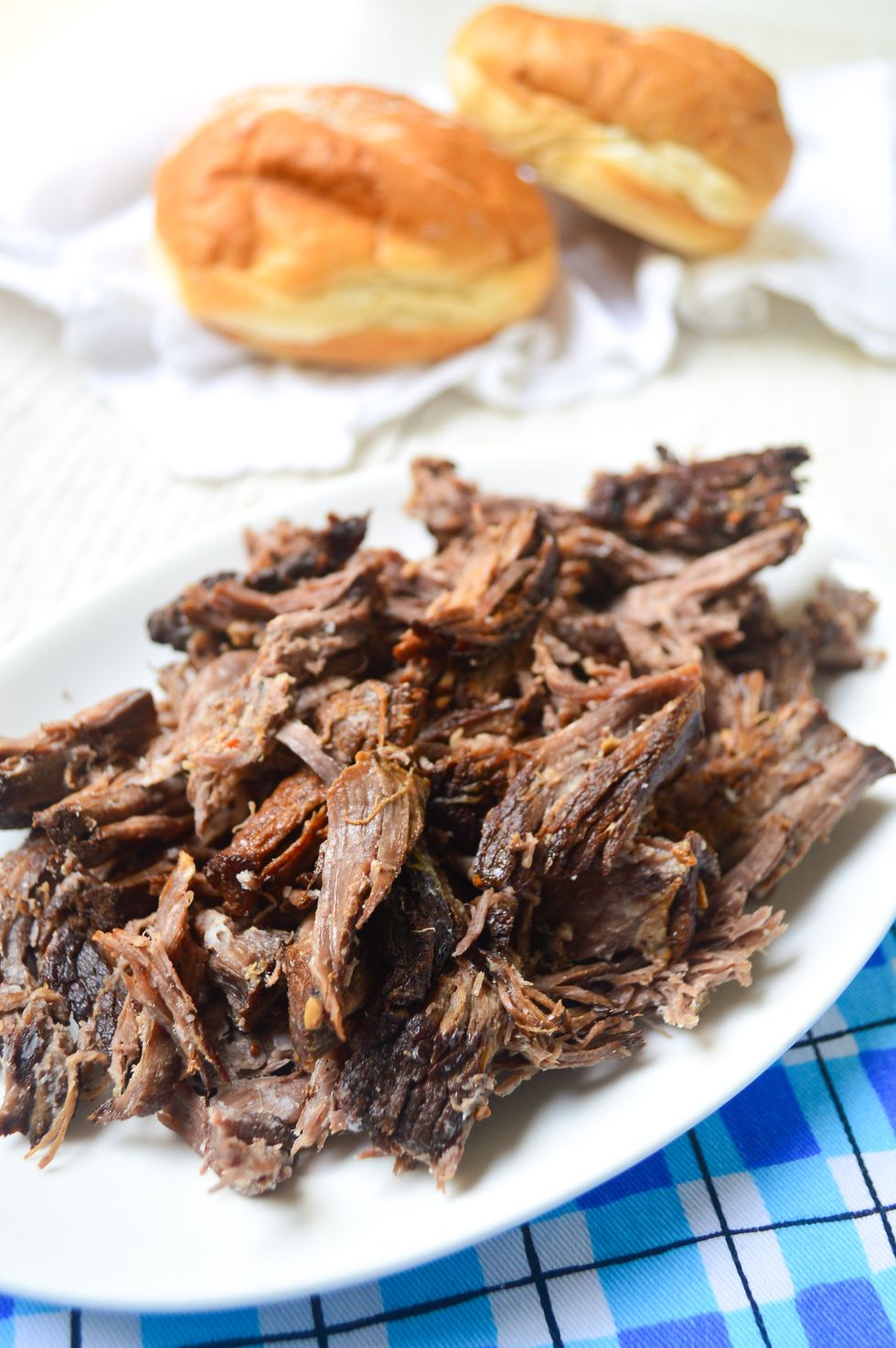 This slow cooked roast beef is pure comfort food- tender beef cooked with garlic, beef broth, and the secret weapon- balsamic vinegar. Serve on toasted buns with melted provolone cheese, or dipped in the remaining liquid from the slow cooker.