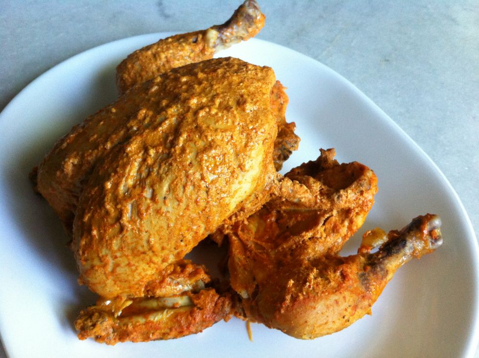 I, then, marinate the chicken with: salt, pepper, paprika, garlic powder, ginger powder, cayenne pepper, chili...