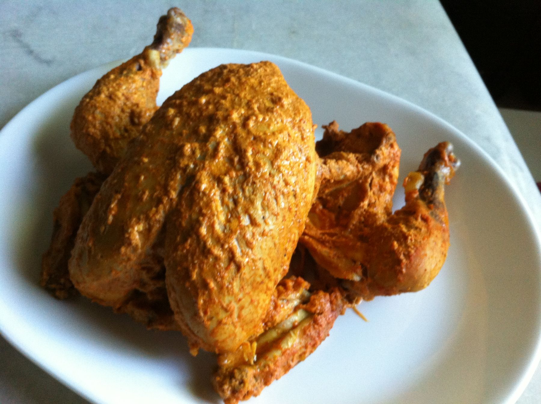 I take a whole chicken and with a fork poke holes all over it (so the marinade seeps inside). I, then, marinate the chicken with: salt, pepper, paprika, garlic powder, ginger powder, cayenne pepper, chili...