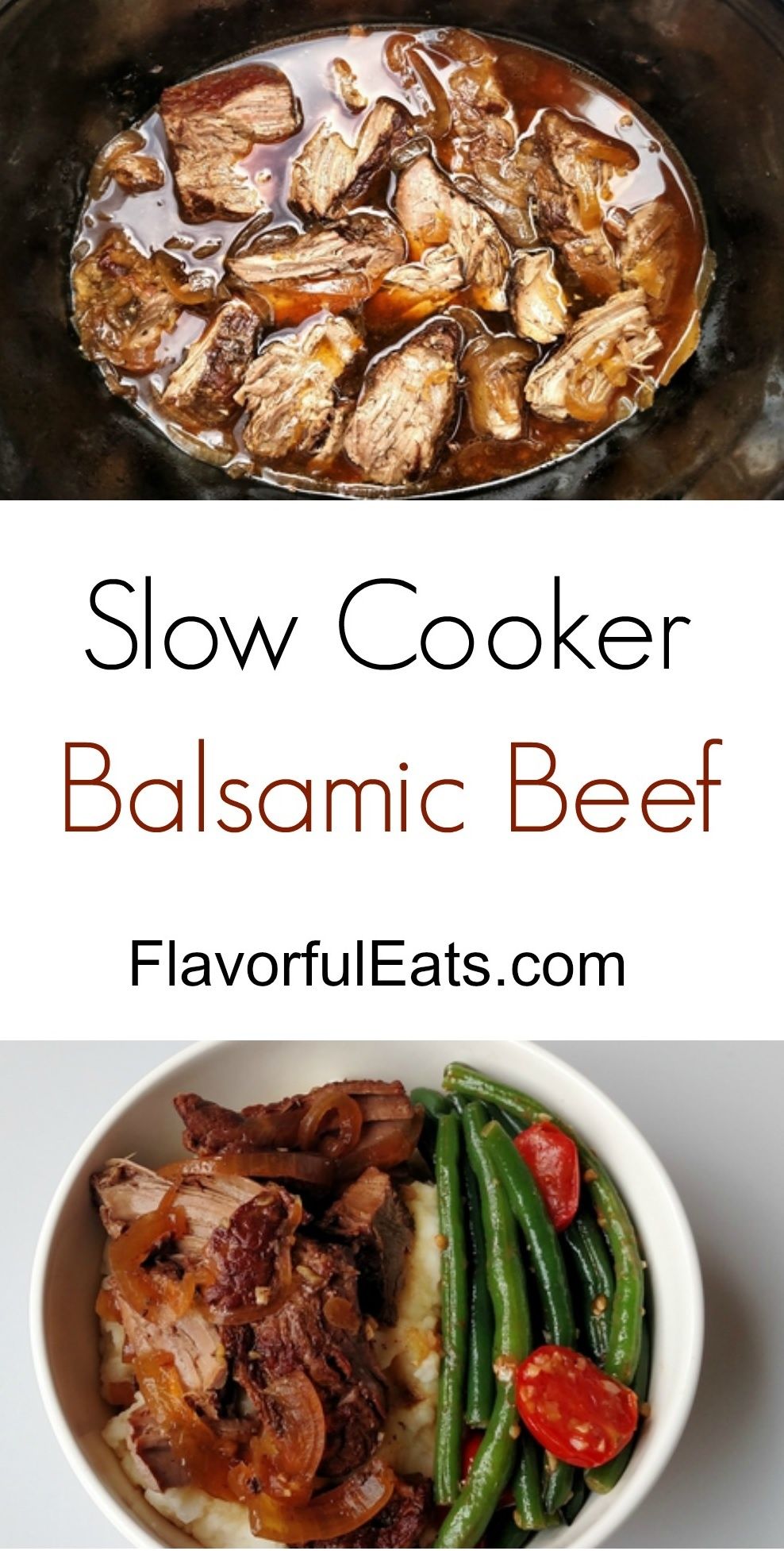 Chunks of tender beef roast slow cooked with onion, garlic, and balsamic vinegar create a savory Slow Cooker Balsamic Beef that's perfect over mashed potatoes, egg noodles, or rice.