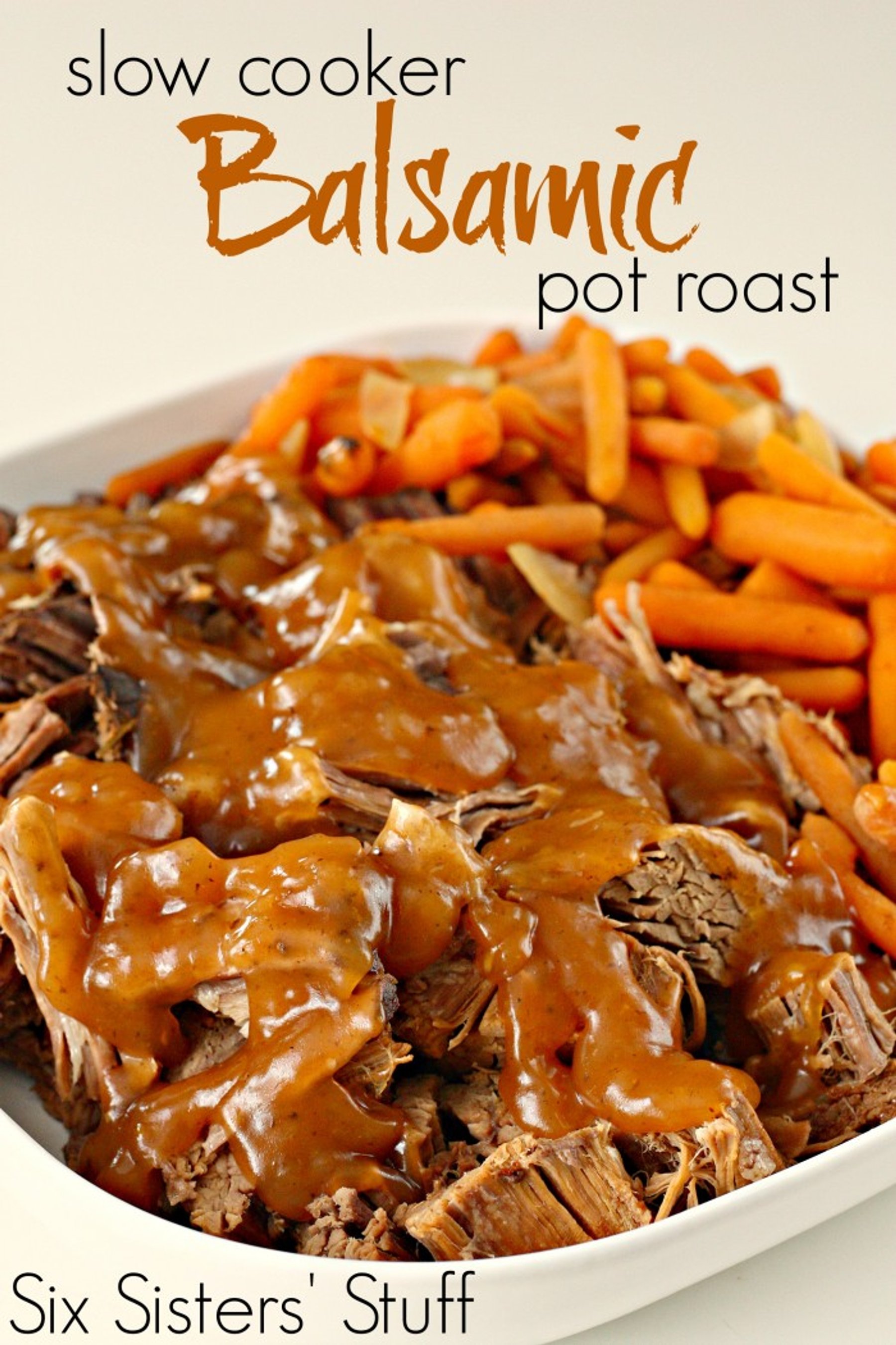 I prefer to cook my pot roast in my slow cooker. This recipe is one of the most tender and juicy pot roasts I have had in a while- and the flavor from the herbs and balsamic vinegar is delicious!