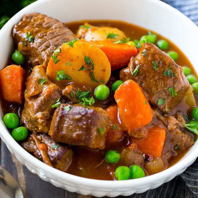 This slow cooker beef stew is loaded with chunks of tender beef, potatoes, carrots and peas. It's a hearty and comforting one pot meal where the crock pot does all of the work!