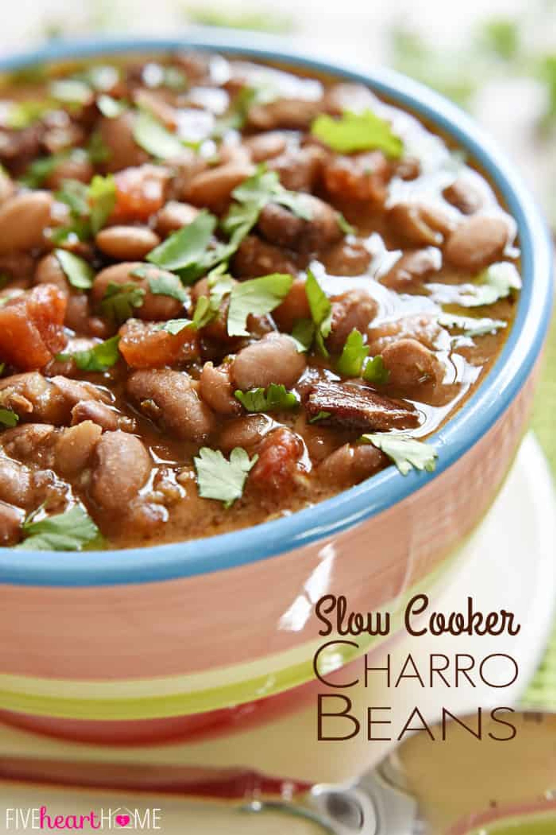 Slow Cooker Charro Beans are flavored with bacon, garlic, tomatoes, green chiles, jalapeños, cilantro, and spices...a perfect side dish for Mexican food!