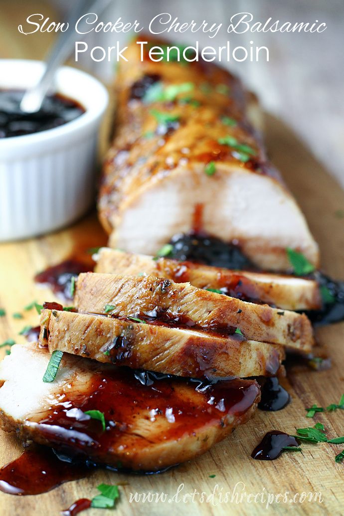 Slow Cooker Cherry Balsamic Pork Tenderloin: Pork tenderloin is slow cooked with a cherry balsamic glaze in this easy recipe that's simple enough for week nights, but fancy enough for company.