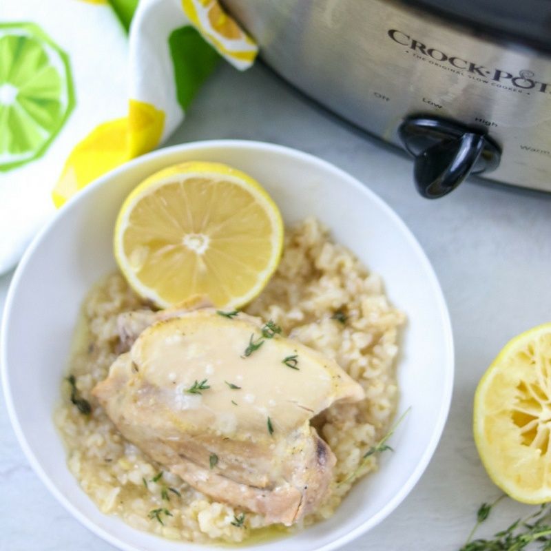 Chicken thighs & rice cook up perfectly with garlic, lemon and thyme for an easy, wholesome family meal in the slow cooker.