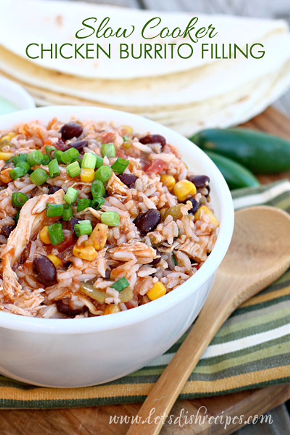 Chicken, rice, beans, corn and more, cooked in the slow cooker and ready to be rolled up in warm tortillas.