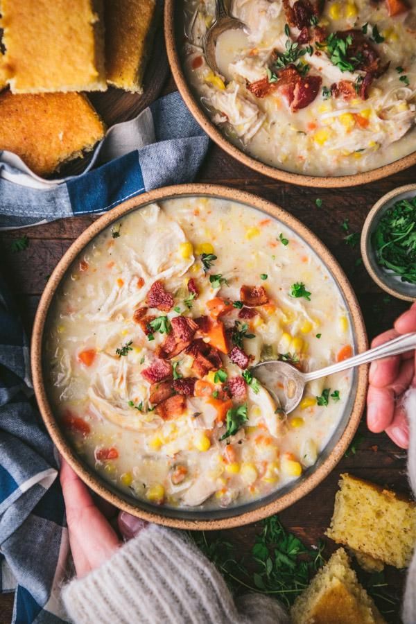 This hearty and delicious Chicken Corn Chowder comes together in the slow cooker for an easy dinner recipe that warms you from the inside out! With potatoes, corn, tender chicken, fresh herbs, and crispy, smoky bacon, the thick, rich chowder is a delicious blend of sweet, creamy, and savory ingredients. Serve each bowl with a loaf of crusty bread, flaky buttermilk biscuits, a pan of honey cornbread, or a simple green salad!