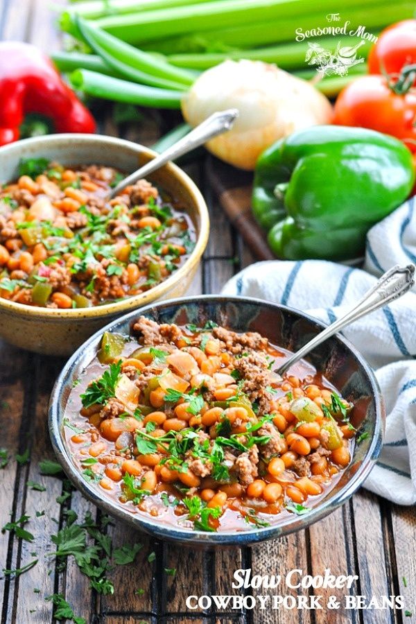 Sweet, savory, tangy and satisfying, Slow Cooker Cowboy Pork and Beans are loaded with ground beef, navy beans, vegetables, and a tomato-based sauce. The easy dinner or potluck side dish is like a perfect cross between chili, baked beans, and a Sloppy Joe!