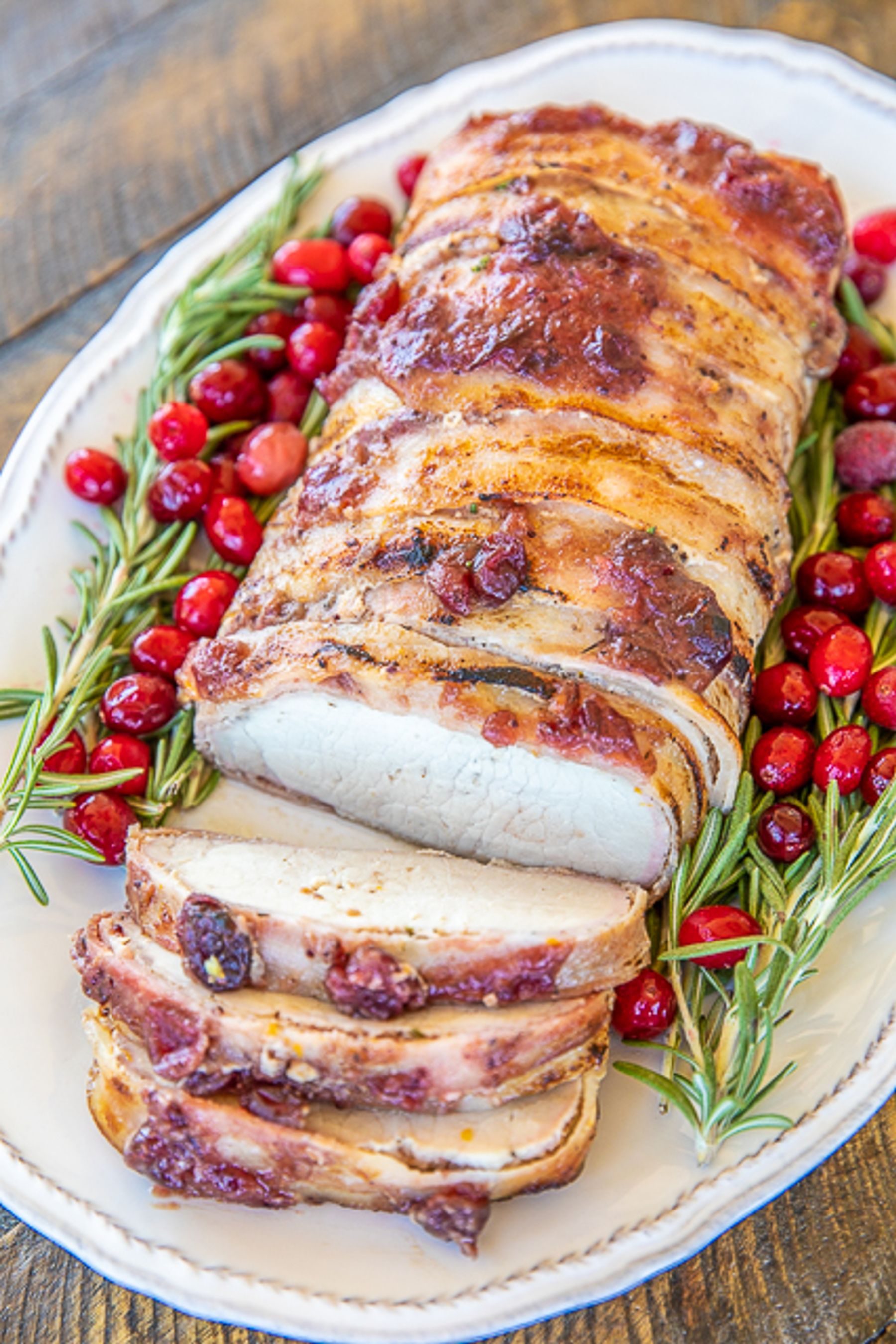 Slow Cooker Cranberry Orange Pork Loin - Holiday Pork Loin - a great alternative to turkey at the holidays! SO tender and delicious! Everyone cleaned their plates and went back for seconds!!! Pork loin rubbed in brown sugar, garlic, rosemary, salt and pepper then wrapped in bacon and topped with cranberry sauce, orange juice, orange zest and dijon mustard. This is seriously delicious!!! Grab an Iowa Pork produced pork loin and give this a try for your holiday meal! #slowcooker #crockpot #pork