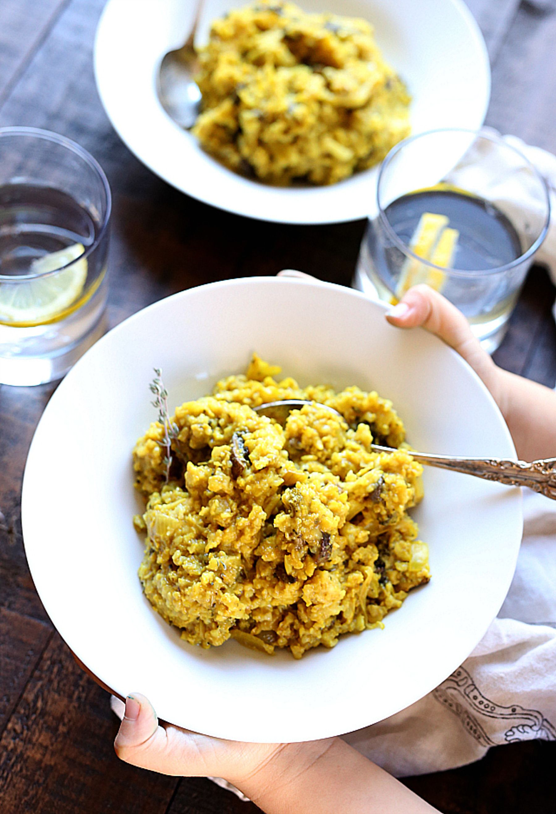 Easiest curry rice recipe slowly marinated Indian spices in the slow cooker with cabbage, broccoli and mushrooms. An excellent vegetarian kid-friendly dish! Serve as a side or add cannelini beans and broth to turn into soup.