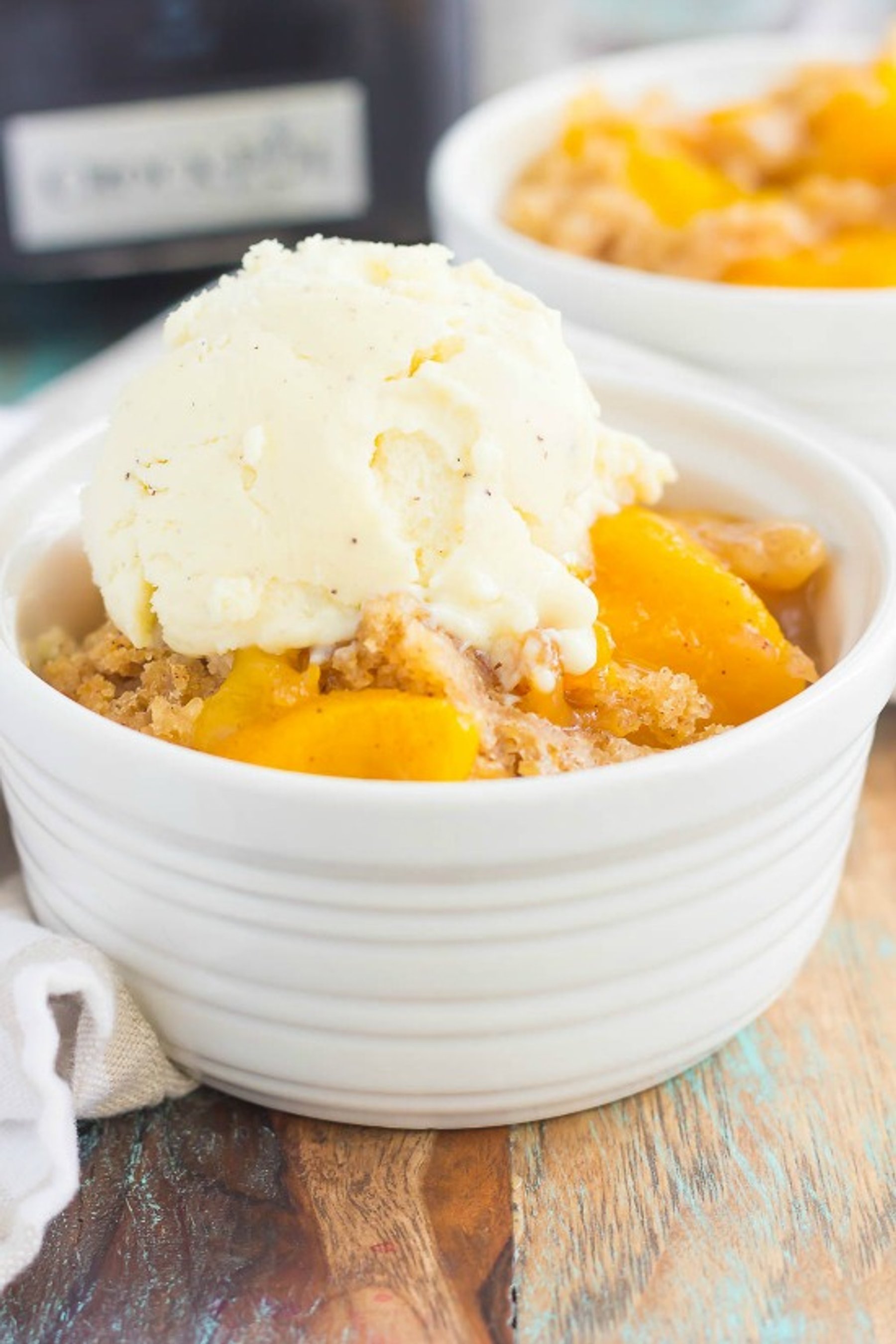 This Slow Cooker Peach Cobbler is loaded with juicy peaches, a sprinkling of cozy spices, and layered with a crispy, cakey topping!